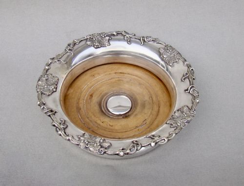 This is a very decorative decanter coaster by Thomas Wilkinson, a renowned Old Sheffield maker and later firm. Dating circa 1835, the everted sides applied with naturalistic twigs and fruiting vines, very much in the William IV style. The turned fruitwood base with a central silvered button. The underside with the original green baize.