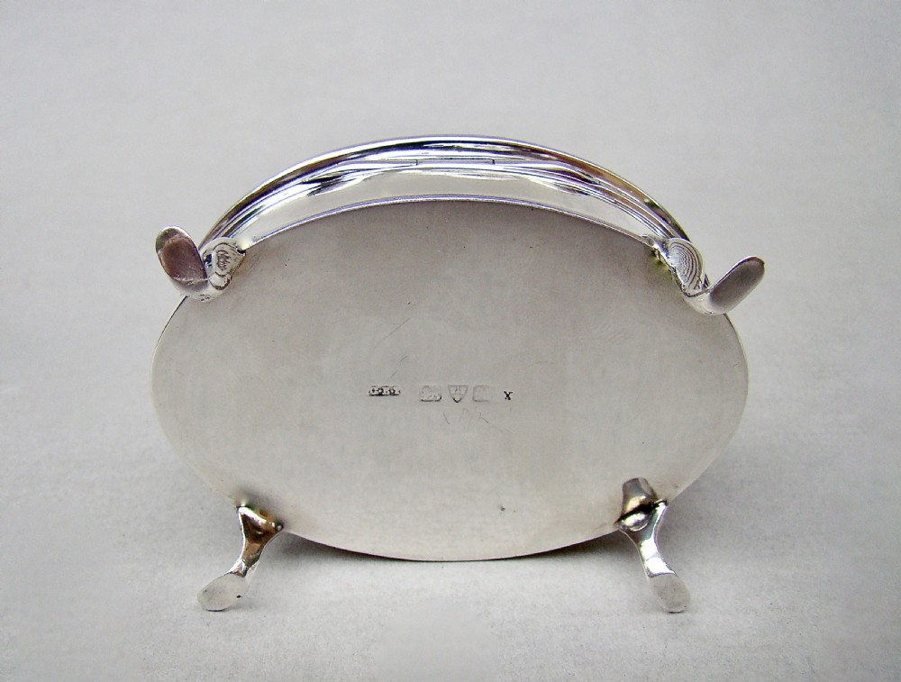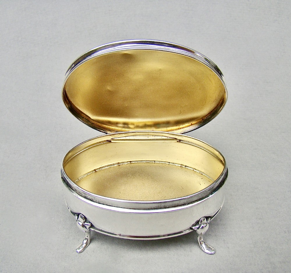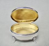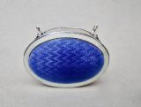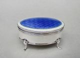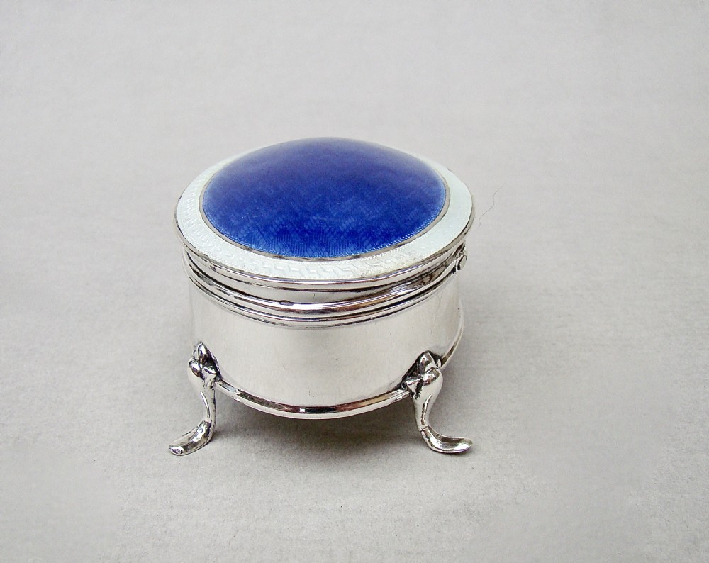 This fabulous and rare Edwardian silver mounted dual colour guilloche enamel jewellery box is dated Chester 1908 and was made by Charles Edwin Turner. Of oval form, the cover with a vivid blue engine-turned guilloche enamel background and surrounded by an elegant silver rimmed white border. The hinged cover opening to reveal a gilt interior. Raised on four elegant cabriole legs. The base solid silver and fully hallmarked.