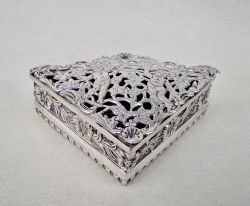 This charming Edwardian enamelled glass trinket box is hallmarked for A Bromet & Co and dated Birmingham 1902. The silver pull-off lid embossed with floral sprays surrounding a vaxcant cartouche. Fitted on a compressed clear glass base heightened with white enamel flower heads and dots. The inner lid with pale gilt wash. Dimensions: Diameter: 6.5cm / 2.4 inches. Height: 2.5cm / 1 inch. Condition: Very good. Postage: PLEASE DO NOT FORGET TO ADD POSTAGE AT CHECKOUT. Postage UK: £8 Special Delivery. Postage overseas: £15 International signed For You can pay by PayPal, bank transfer, cheque, debit or credit card. To pay by PAYPAL please add P&P and click on button below. To pay by credit or debit card over the phone or by cheque, please contact me on 01449 760 585. Internal Ref: MAY82