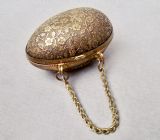 This is an exquisite 19th. C French 19th gilt metal thimble in its original egg-shaped ormulu thimble case. The outer case chased all over with blossom flowers and fitted with a suspension chain. The side with a thumb-piece opening to reveal the original interior fitted with Royal blue silk and crushed green velvet. So often, the interior of these holders are missing. This is a beautiful complete example.
