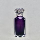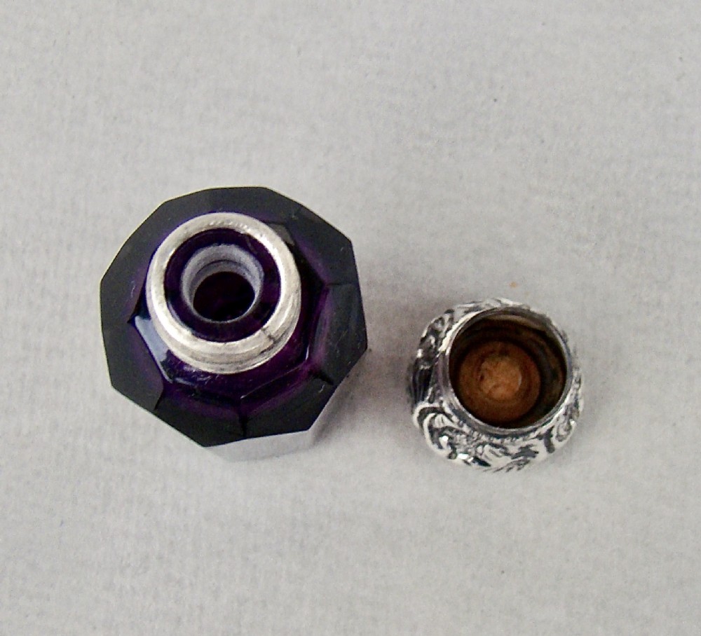 This is a very pretty small-sizedVictorian silver mounted amethyst glass scent bottle. The body sliced-cut with panels. Mounted with a silver screw top lid embossed with a decorative flower head and scrolls. The inner lid with original cork.