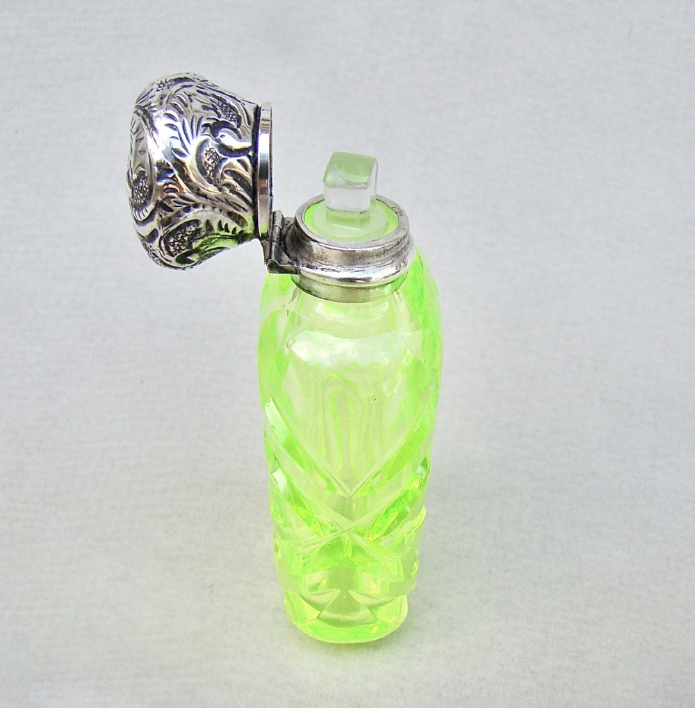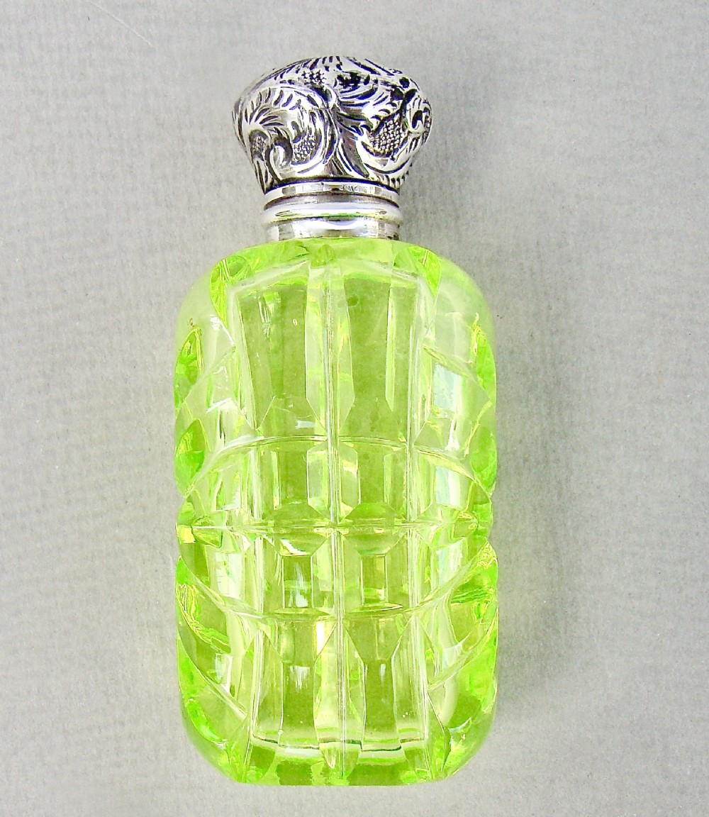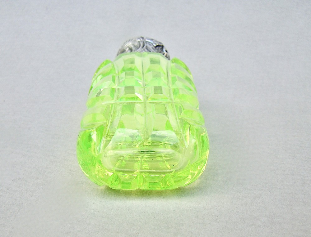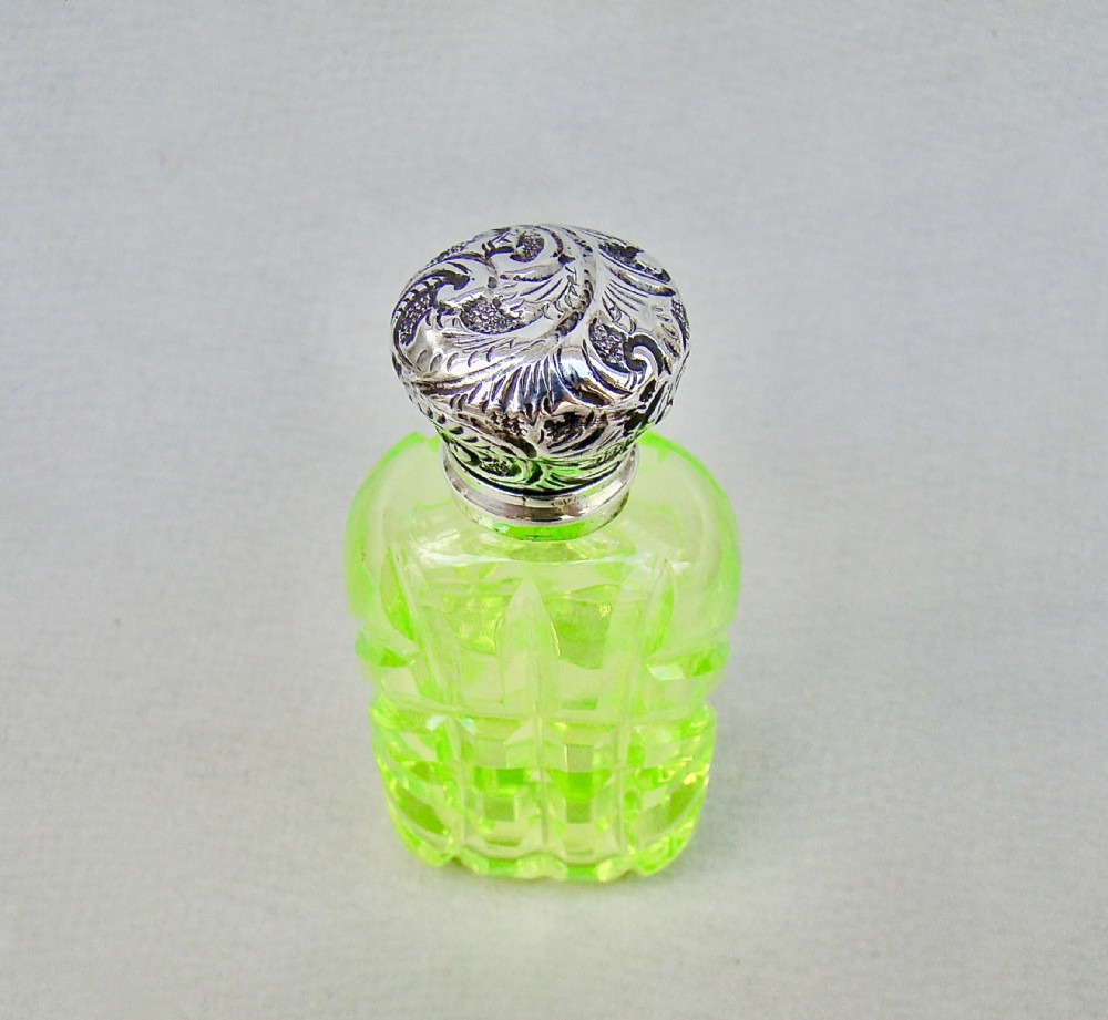 This striking Victorian silver and uranium glass scent bottle dates circa 1890. The vivid yellow glass body sliced-cut in geometric patterns. Mounted with a hinged silver lid embossed with foliate patterns. The neck fitted with a clear glass stopper. Hallmarks: Not hallmarked, as it very often was the case with scent bottle lids, but tested as silver. Dimensions: Height: 8.5cm / 3.2 inches. Width: 3.5cm / 1.3 inches. Depth: 2cm / 0.6 inches. Condition: Glass in very good condition Inside of neck in excellent condition. No cracks. Silver lid in very good condition. Postage PLEASE DO NOT FORGET TO ADD POSTAGE AT CHECKOUT. Postage UK: £5 Royal Mail Tracked 24. Postage overseas: £20 International Signed For. You can pay by PayPal, bank transfer, cheque, debit or credit card. To pay by PAYPAL please add P&P and click on button below. To pay by credit or debit card over the phone or by cheque, please contact me on 01449 760 585. Internal Ref: OCT84