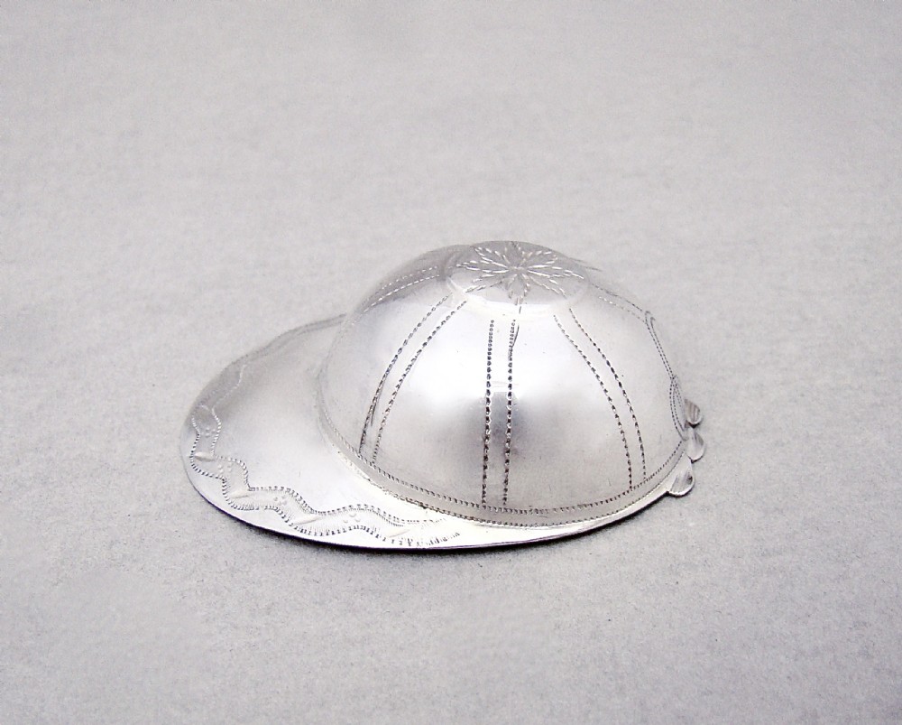 This delightful George III silver jockey cap caddy spoon was made by the renowned Birmingham toy maker* Joseph Taylor silversmith Elizabeth and is dated Birmingham 1799. The circular bowl with a bright-engraved centre and peak. The back with a narrow quatrefoil handle. Georgian Jockey cap caddy spoons are very collectable rather scarce and this is a great, fully hallmarked, example.