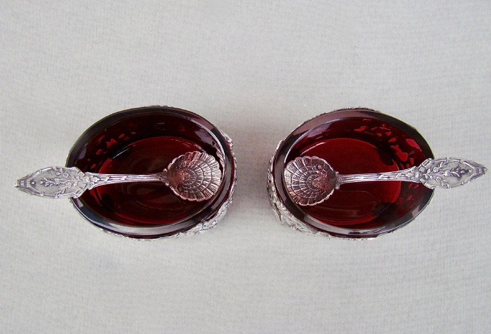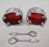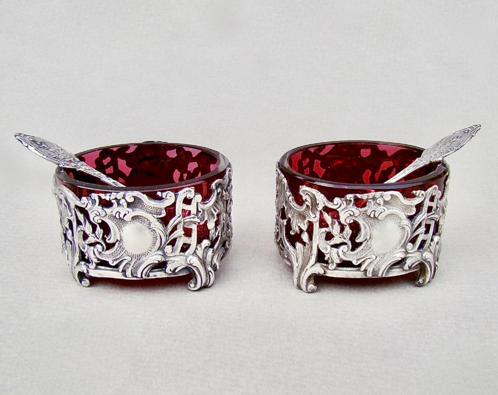 This is a delightful and unusual pair of late 19th Century French high grade silver open salts. Each of oval outline, the pierced rococo sides with cranberry glass liners. Raised on four stylised leaf-capped bracket feet and sold with associated solid silver salts spoons. The spoosn with a dco Hallmarks: EF for Edouard Foureau. Head of Minerva with mint-mark 1 (950 standard of fineness) Condition: Very good No dings or dents. Liners in good condition. Dimensions and Weight: Height: 3.5cm / 1.2 inches. Length: 5cm / 2 inches. Width: 4cm / 1.5 inches. Delivery: PLEASE DO NOT FORGET TO ADD POSTAGE AT CHECKOUT. Postage UK: £5 Royal Mail Tracked 24. Postage USA (including US import duties): £30.00 Postage overseas: £20 International Signed For. You can pay by PayPal, bank transfer, cheque, debit or credit card. To pay by PAYPAL please add P&P and click on button below. To pay by credit or debit card over the phone or by cheque, please contact me on 01449 760 585. Internal Ref: OCT69