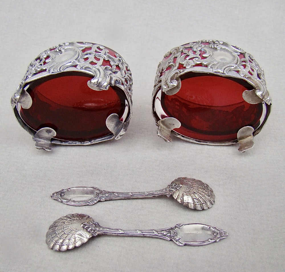 RARE PAIR OF 19TH CENTURY FRENCH SILVER SALTS & SPOONS, CIRCA 1890