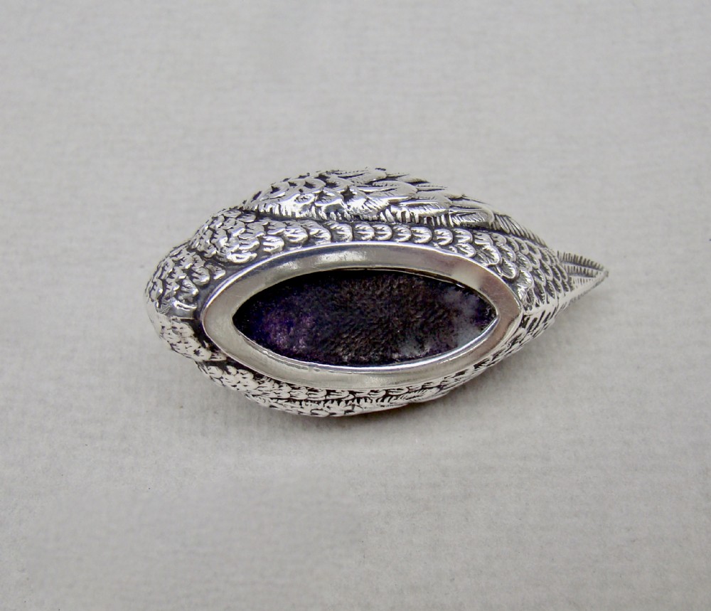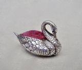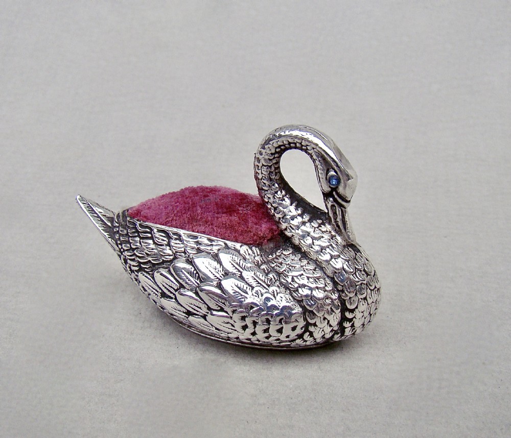 This delightful Edwardian silver swan pin cushion bears the marks of Adie & Lovekin and is dated Birmingham 1908. The body with detailed plumage rests on an oval silver base. The eyes inset with blue glass stones, a rare and exquisite detail. The original cushion finished in pink velvet. Hallmarks: AL&L for Adie & Lovekin. Birmingham Assay Mark. Lion Passant. Date letter "i" for 1908. Condition: Good. Very clear hallmarks. Cushion in good condition. Main body in excellent condition. Top of the swan's head with dent, reflected in the p[rice. Dimensions: Length: 6cm / 2.2 inches. Height: 4cm / 1.4 inches. Width: 2.5cm / 1 inches. Postage: PLEASE DO NOT FORGET TO ADD POSTAGE AT CHECKOUT. Postage UK: £9 Special Delivery Next day. Postage overseas: £17 International Signed For. You can pay by PayPal, bank transfer, cheque, debit or credit card. To pay by PAYPAL please add P&P and click on button below. To pay by credit or debit card over the phone or by cheque, please contact me on 01449 760 585 Internal Ref: OCT68