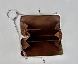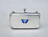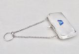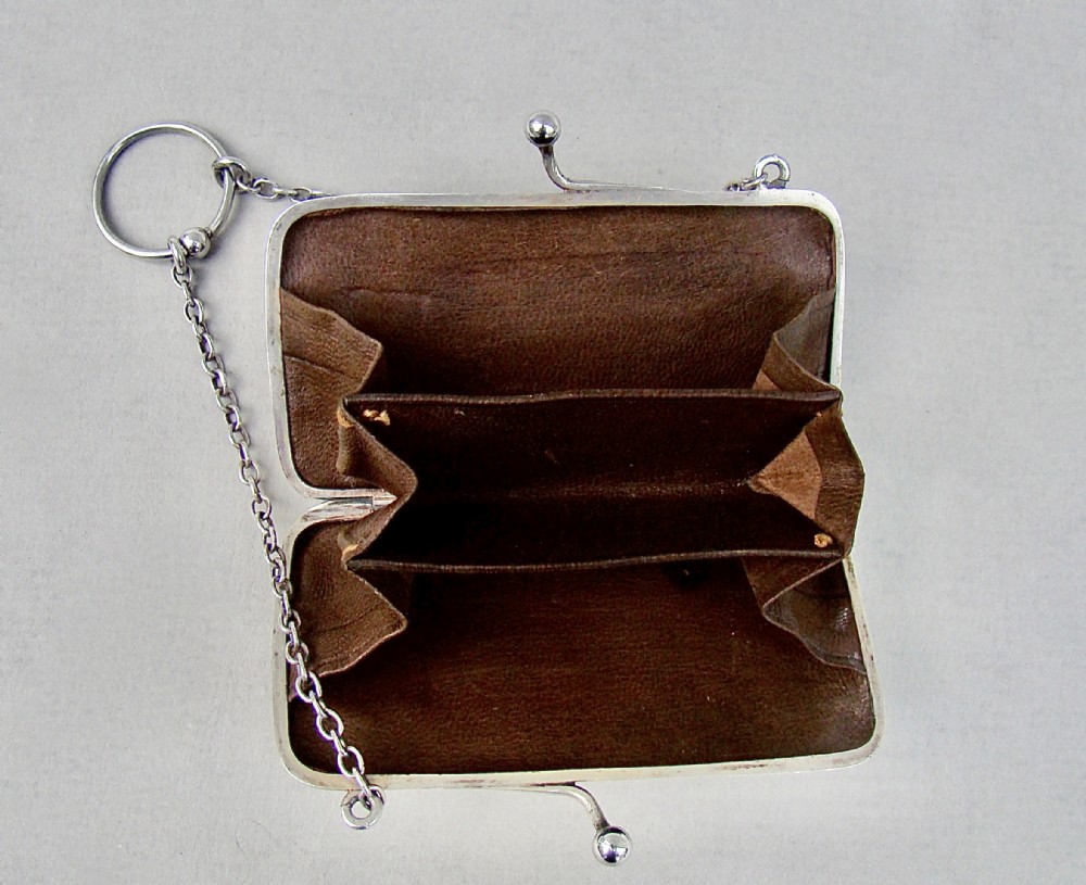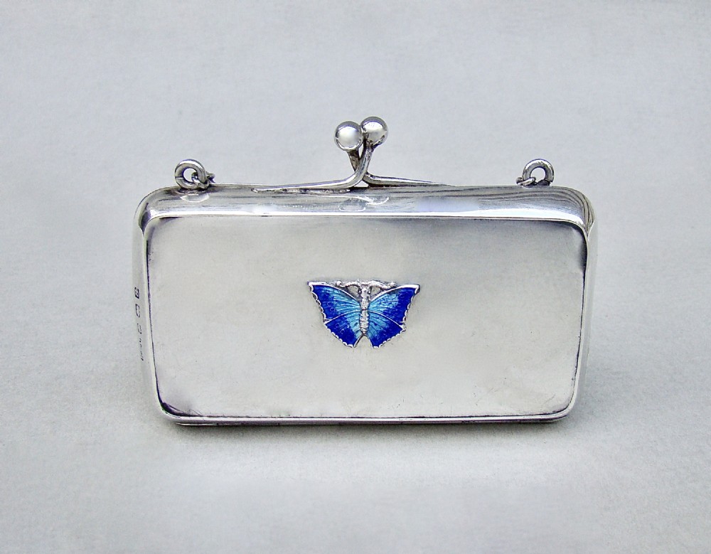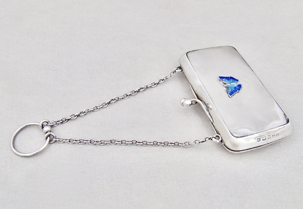 This elegant and unusual silver purse was made by Henry Clifford Davis and is dated Birmingham 1917. Of rounded rectangular form, the plain front applied with a guilloche enamel butterfly. The top fitted with a chain attachment and finger ring. The clasp opening to reveal the original leather interior.