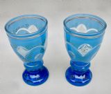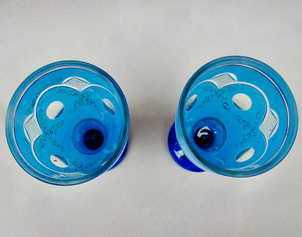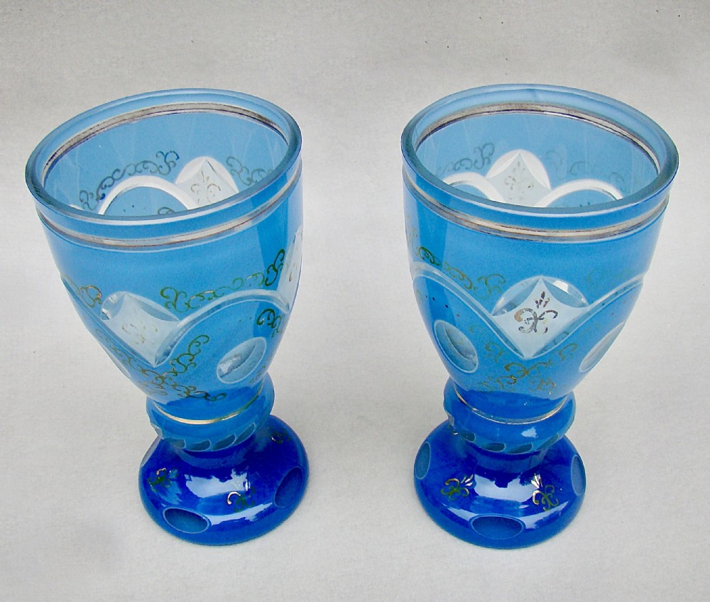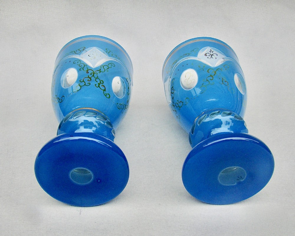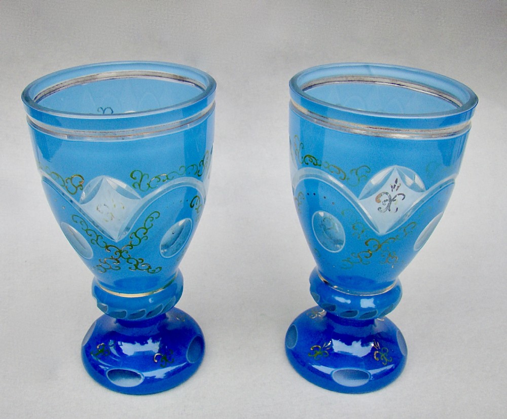 This is a beautiful pair of large Victorian Bohemian glass goblets. Of baluster form, each goblet having a turquoise opaque body cut to white opaline glass then to clear glass with geometric patterns. The reserves and borders heightened with gilt decorations.Raised on a knopped hollow baluster foot. Smooth pontil mark to the underside Dimensions: Height: 16cm / 6.2 inches. Diameter of rim: 8.8 cm / 3.2 inches. Diameter of foot: 7cm / 2.6 inches. Condition: Very good. No chips or cracks. Gilt decorations rubbed at places. Delivery: PLEASE DO NOT FORGET TO ADD POSTAGE AT CHECKOUT. Postage UK: £5 Royal Mail Tracked 24. Postage overseas: £35 International Signed For. Postage USA (including US import duties): £55.00 You can pay by PayPal, bank transfer, cheque, debit or credit card. To pay by PAYPAL please add P&P and click on button below. To pay by credit or debit card over the phone or by cheque, please contact me on 01449 760 585. Internal Ref: NOVE77