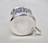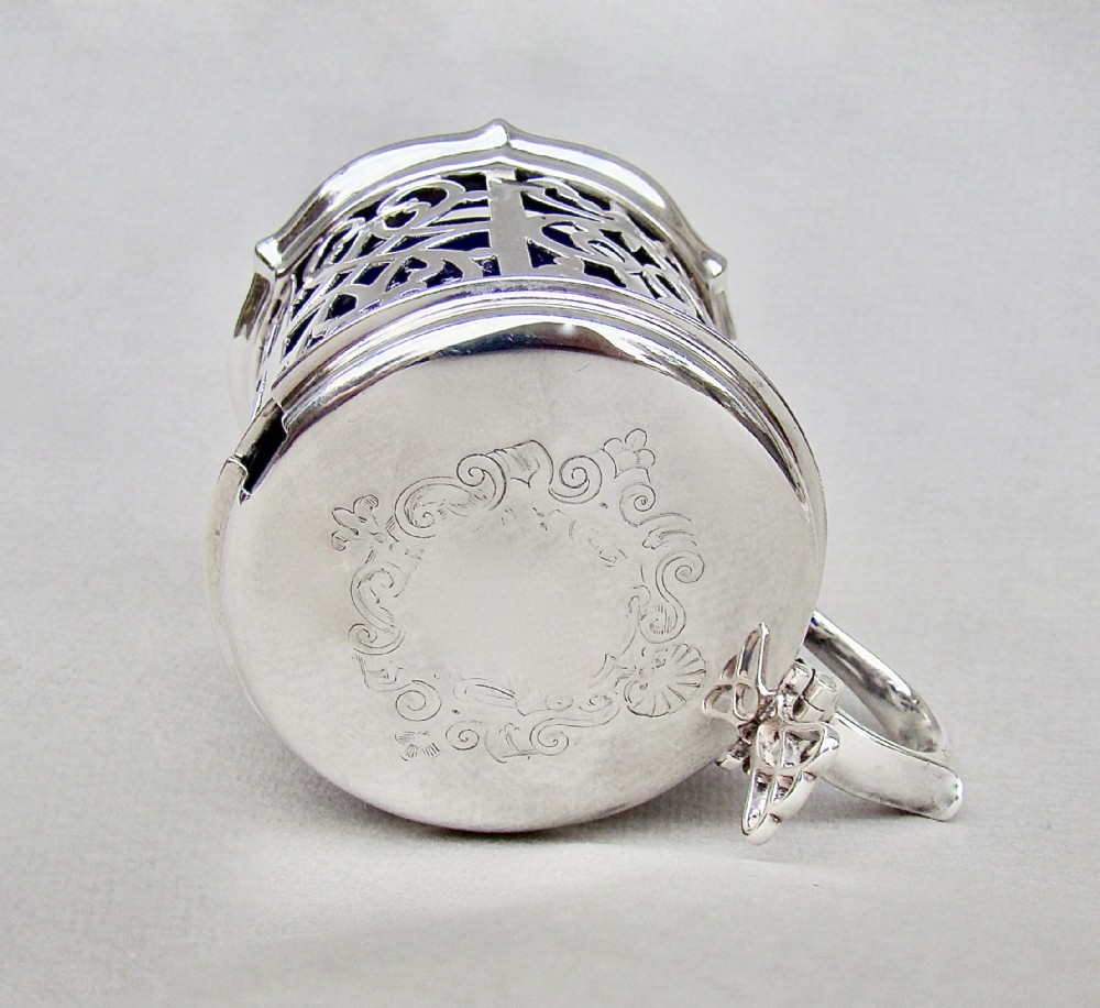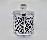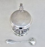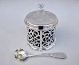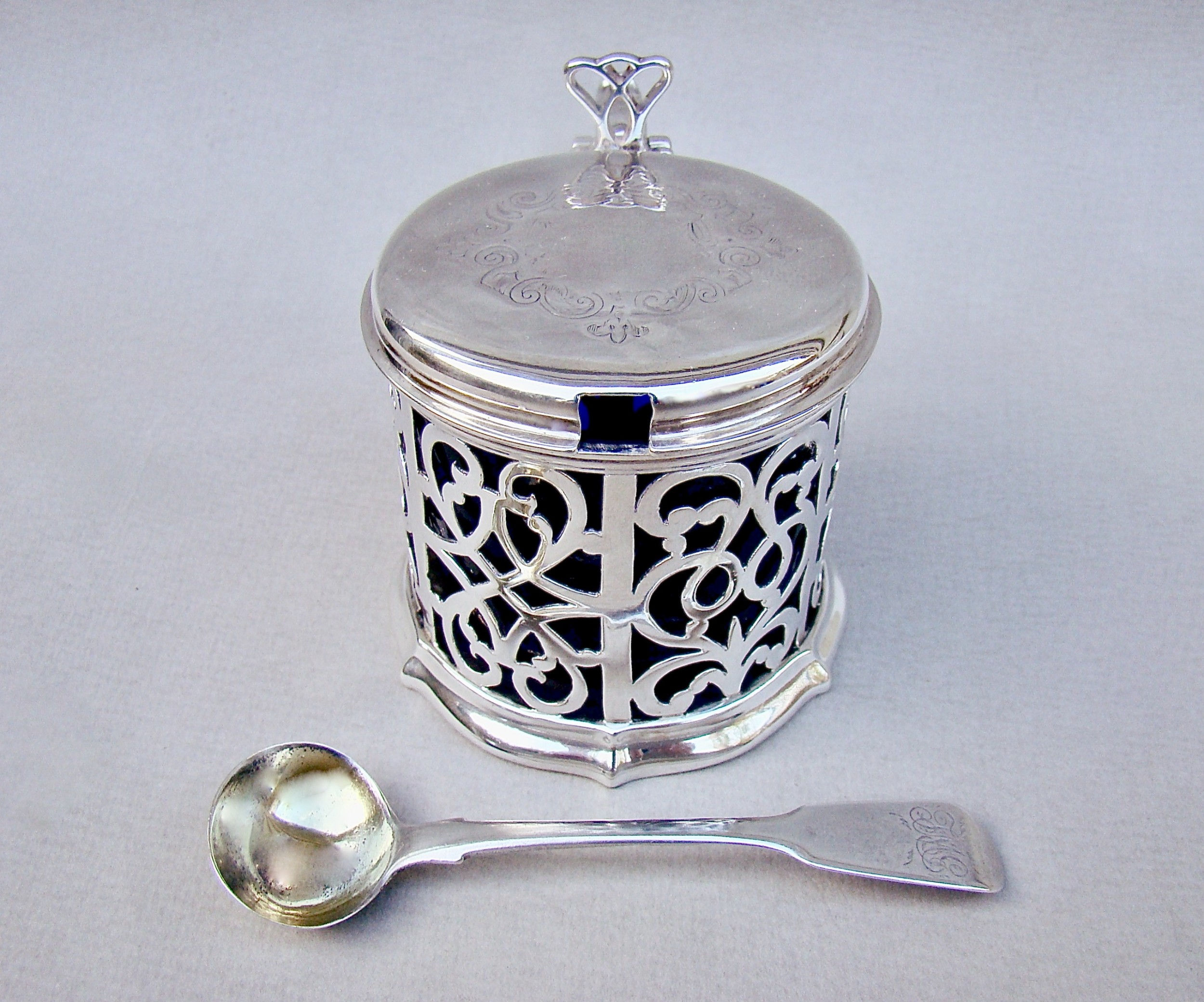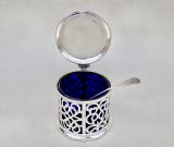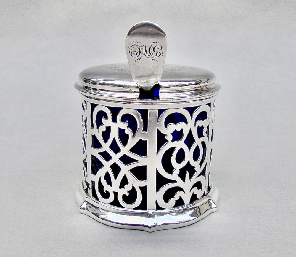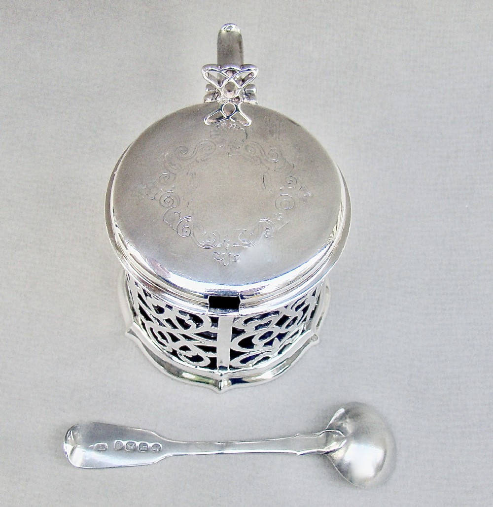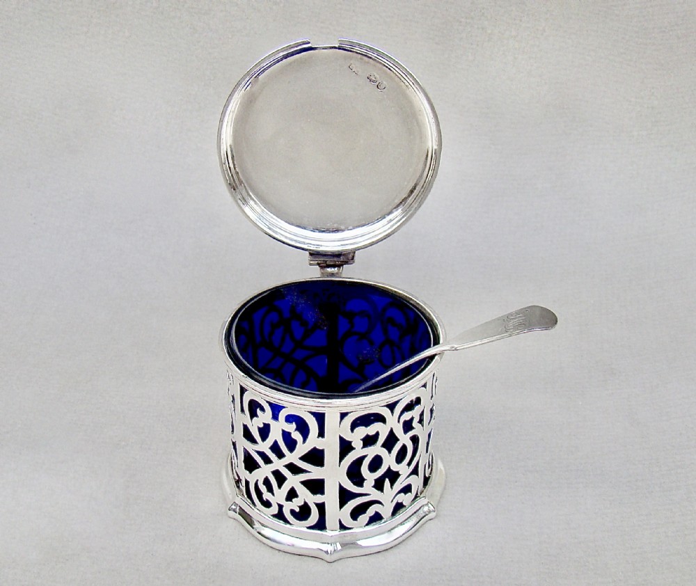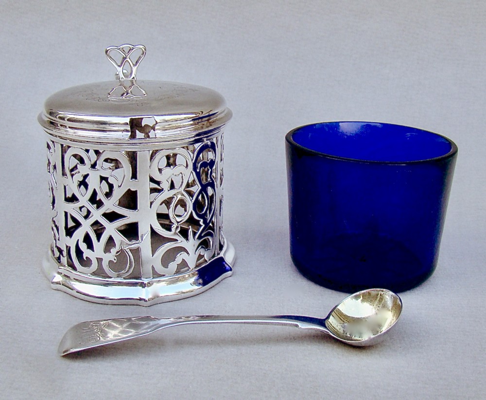 This superb quality solid silver large mustard pot was made by the renowned Barnard family and is dated London 1849. The generous drum-shaped body pierced with panels of intricate foliate scrolls very much in the Gothic style of the era. The engraved hinged cover with a pierced thumb piece.The back with a shaped scroll handle. The inner lid partially hallmarked and the spread circular base fully hallmarked on the underside. The interior fitted with the original star-cut Bristol blue glass liner. Sold with an associated Georgian silver mustard spoon by Robert Rutland dated London 1823 Hallmarks: Hallmarks: EB over JB over WB for Edward, John & William Barnard. Lion Passant. London Assay Mark. Duty Mark. Date letter "O" for 1849. Condition: Very good No dings or dents. No loss to the pierced decorations. Liner in perfect condition. Good hinge . Dimensions and Weight: Height up to thumbpiece: 8cm / 3.2 inches. Diameter: 7.5cm / 3 inches. Weight excluding liner: 142 g / 5 oz. Delivery: PLEASE DO NOT FORGET TO ADD POSTAGE AT CHECKOUT. Postage UK: £8 Special Delivery Next day. Postage overseas: £17 International Signed For. You can pay by PayPal, bank transfer, cheque, debit or credit card. To pay by PAYPAL please add P&P and click on button below. To pay by credit or debit card over the phone or by cheque, please contact me on 01449 760 585. Internal Ref: NOVE76
