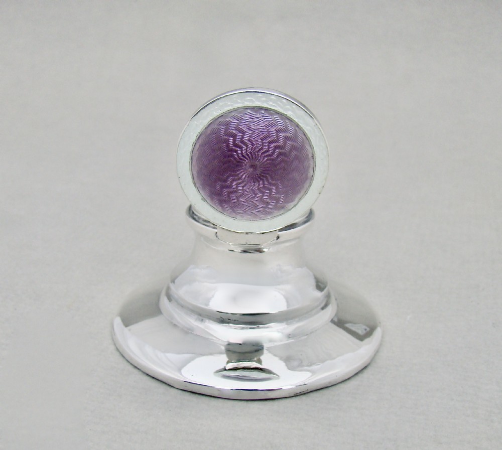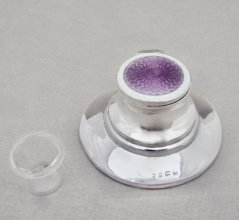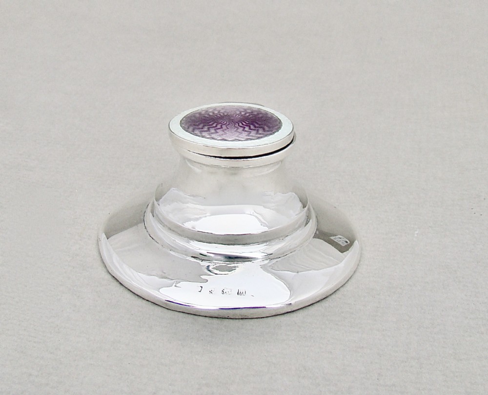 This exquisite silver and dual coloured enamelled silver capstan inkwell is dated Birmingham 1911. The hinged silver lid mounted on a spread circular base. The cover inset with a pale lilac engine-turned guilloche enamel background and surrounded by an elegant silver rimmed white border. Of traditional Capstan form, it is very elegant elegant. Complete with the original inner glass receptacle. Loaded spread circular body lined with black Morocco leather. Gilt inner lid. Hallmarks: Maker's marks erased. Birmingham Assay Mark. Lion Passant. Date letter "m" for 1911. Condition: Very good. The enamel is in very good condition. The hinge is good and strong. Silver base with no dings. Dimensions: Height: 4cm / 1.4 inches. Diameter of base: 7.5cm / 3 inches. Delivery: PLEASE DO NOT FORGET TO ADD POSTAGE AT CHECKOUT. Postage UK: £5 Royal Mail Tracked 24. Postage overseas: £20 International Signed For. Postage USA (including US import duties): £45.00 You can pay by PayPal, bank transfer, cheque, debit or credit card. To pay by PAYPAL please add P&P and click on button below. To pay by credit or debit card over the phone or by cheque, please contact me on 01449 760 585. Internal Ref: NOVE66