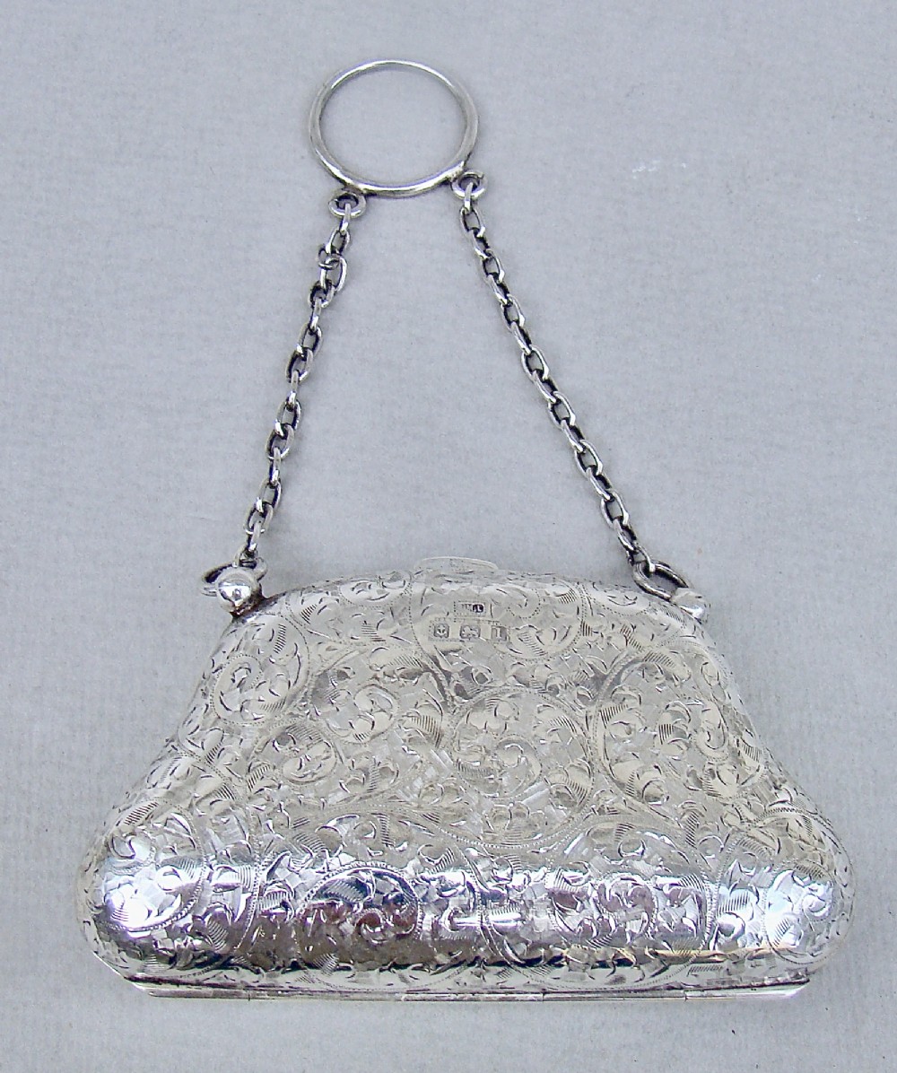 This very pretty George V sterling silver purse was made by the prolific Samuel Levi and is dated Birmingham 1910. Of conventional form, both sides engraved with foliate scrolls. The front with a vacant cartouche. The push button opening to reveal the original green moire silk compartmentalised interior. The sides fitted with a chain and suspension ring to allow a lady to hold her purse while holding her cocktail glass. Hallmarks: S.M. L for Samuel Levi. Birmingham Assay Mark. Lion Passant. Date letter "l" for 191-. Dimensions: Width: 9cm / 3.4 inches. Height (excluding chain): 5.5cm / 2 inches. Condition: Good throughout. A few minor dingd commensurate with age and use. Good original interior. Delivery: PLEASE DO NOT FORGET TO ADD POSTAGE AT CHECKOUT. Postage UK: £5 Royal Mail Tracked 24. Postage overseas: £20 International Signed For. Postage USA (including US import duties): £45.00 You can pay by PayPal, bank transfer, cheque, debit or credit card. To pay by PAYPAL please add P&P and click on button below. To pay by credit or debit card over the phone or by cheque, please contact me on 01449 760 585. Internal Ref: DEC96