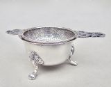 This is a very elegant and excellent quality Mid-Century silver tea strainer bears the marks of the reputed J B Chatterley & Sons Ltd. The mesh like finely pierced circular bowl flanked by exquisite fretwork lug handles and resting on the original circular stand. The circular base raised on three leaf-capped paws. Hallmarks: JBC&S Ltd for J B Chatterley & Sons Ltd. Lion Passant Birmingham Assay Mark Date letter "S" for 1966. Dimensions and weight: Bowl diameter: 5.5cm / 2.2 inches. Length handle to handle: 11cm / 4.2 inches. Height: 4cm / 1.4 inches Combined Weight: 84 g / 3 oz Condition: Excellent. Delivery: PLEASE DO NOT FORGET TO ADD POSTAGE AT CHECKOUT. Postage UK: £5 Royal Mail Tracked 24. Postage overseas: £20 International Signed For. Postage USA (including US import duties): £45.00 You can pay by PayPal, bank transfer, cheque, debit or credit card. To pay by PAYPAL please add P&P and click on button below. To pay by credit or debit card over the phone or by cheque, please contact me on 01449 760 585. Internal Ref: DEC93