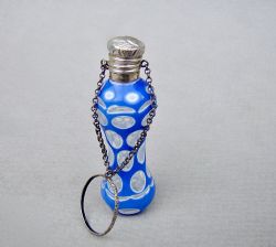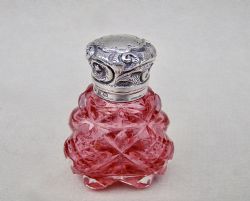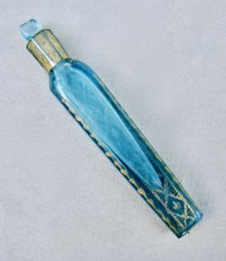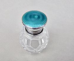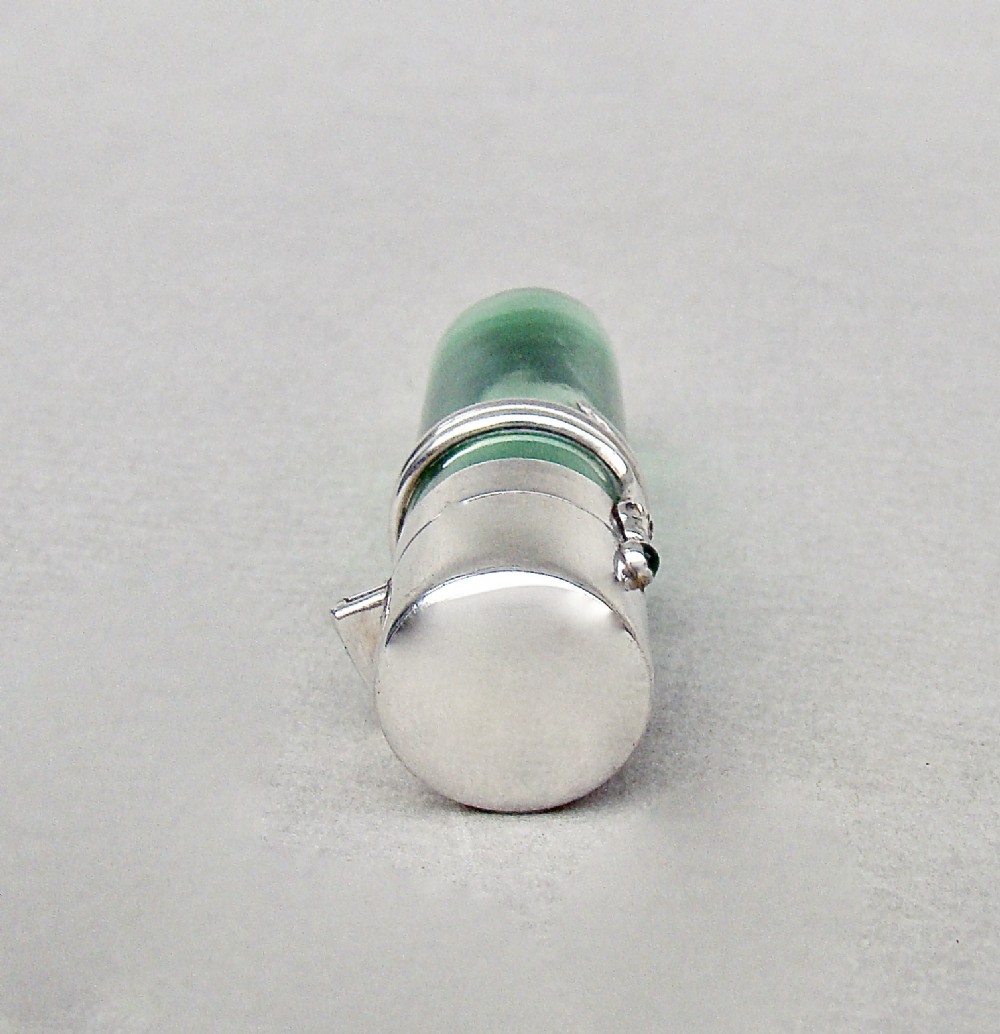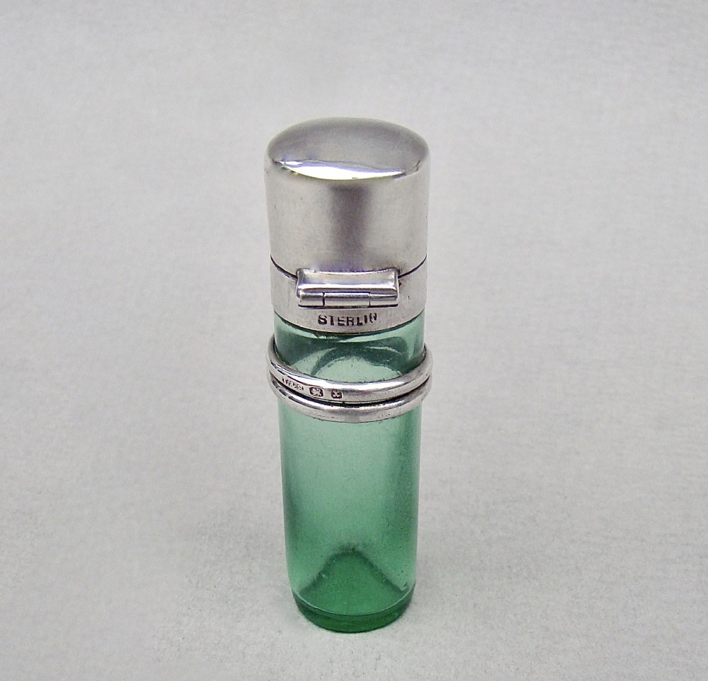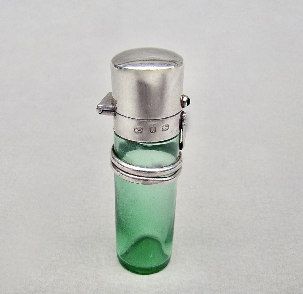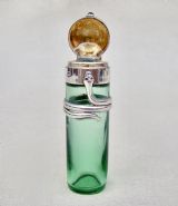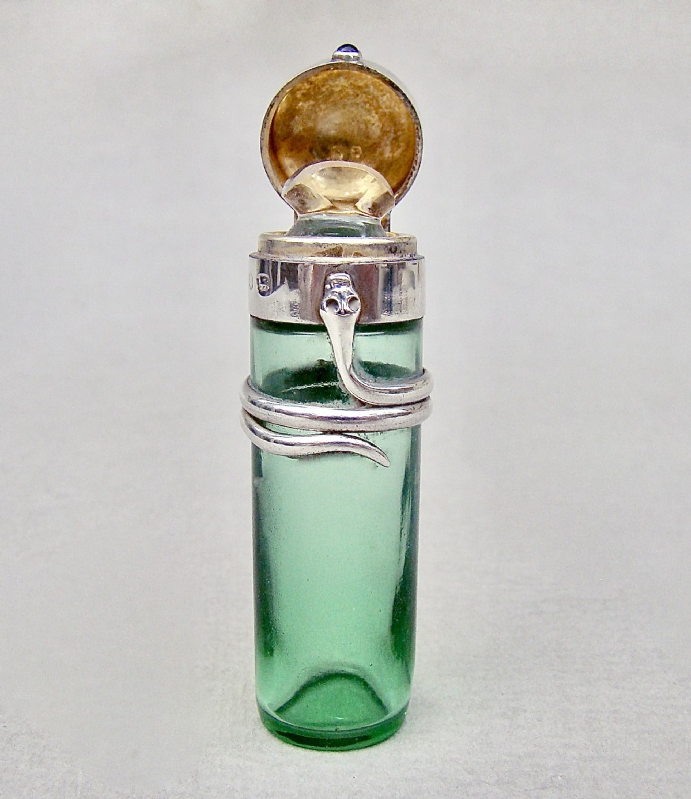 This fabulous silver mounted "snake" green glass scent bottle was made by Levi & Salaman and is dated Birmingham 1897 . The pale green cylindrical glass body with a coiled silver snake , its head on the collar. The hinged lid opening to reveal a rich gilt interior. The neck fitted with the original glass stopper. Snake scent bottles are very few and far between and this is a wonderful example.
