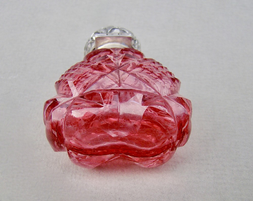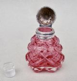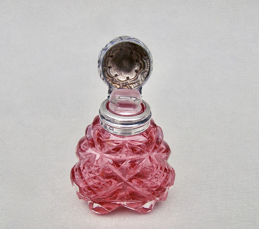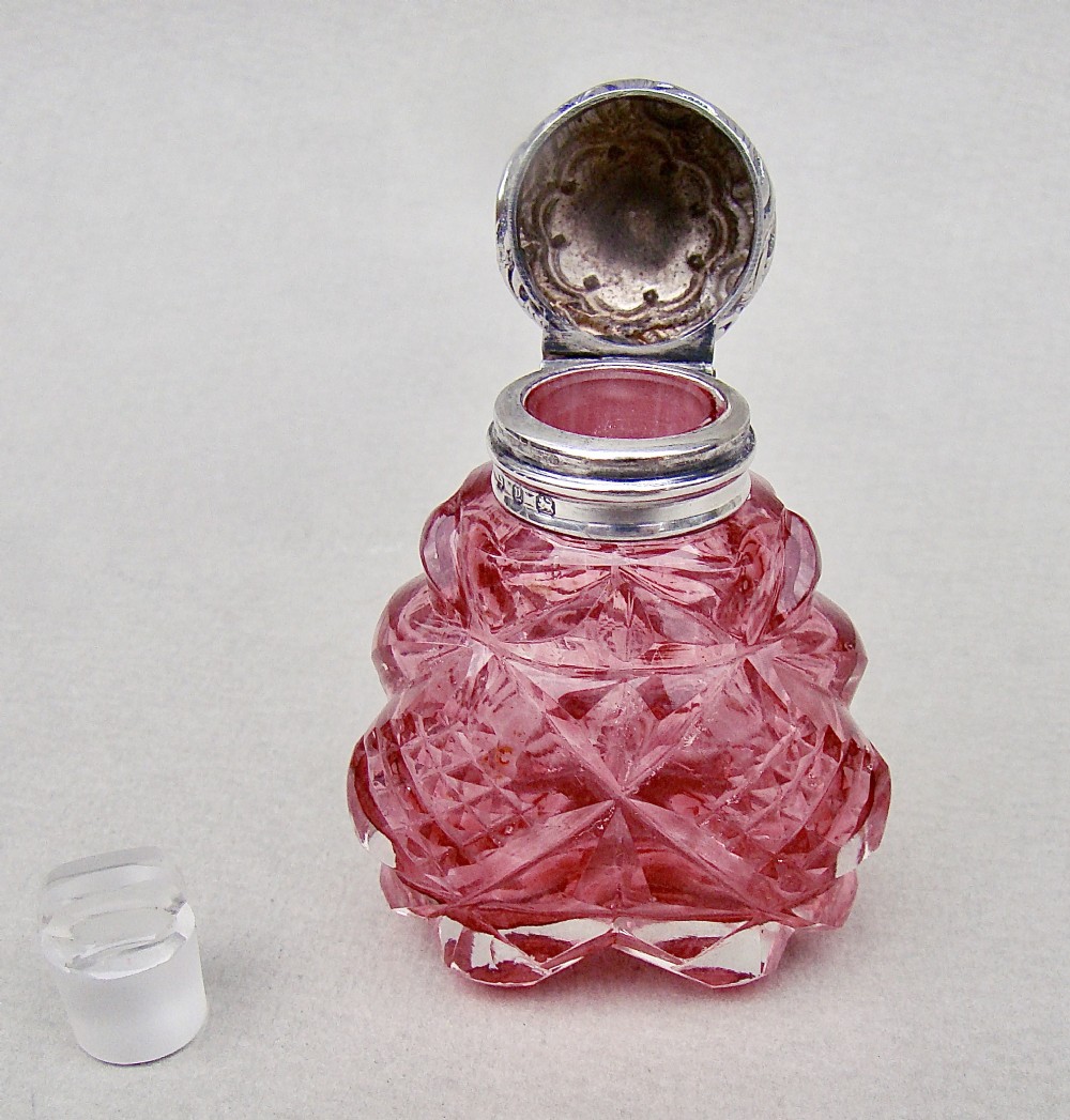 This exquisite Victorian silver mounted pink hobnail-cut glass scent bottle was made by the Mousley Brothers and is dated Birmingham 1898. The hinged embossed silver lid mounted on a tactile sliced-cut glass body. The colour a rather striking pink. The fully hallmarked hinged lid opening to reveal the original glass stopper. Hallmarks: M BROS for the Mousley Brothers. Birmingham Assay mark. Date letter "y" for 1898. Lion passant. Dimensions: Height: 6.5cm - 2.6 inches. Width at widest: 5 cm - 2 inches. Depth: 2.5 cm - 1 inch. Condition: Very good. No dings to silver lid. Glass body, glass neck and glass stopper in perfect condition. Lid a little tight fitting. A fabulous scent bottle. Delivery: PLEASE DO NOT FORGET TO ADD POSTAGE AT CHECKOUT. Postage UK: £5 Royal Mail Tracked 24. Postage overseas: £20 International Signed For. Postage USA (including US import duties): £40.00 You can pay by PayPal, bank transfer, cheque, debit or credit card. To pay by PAYPAL please add P&P and click on button below. To pay by credit or debit card over the phone or by cheque, please contact me on 01449 760 585. Internal Ref: DEC85