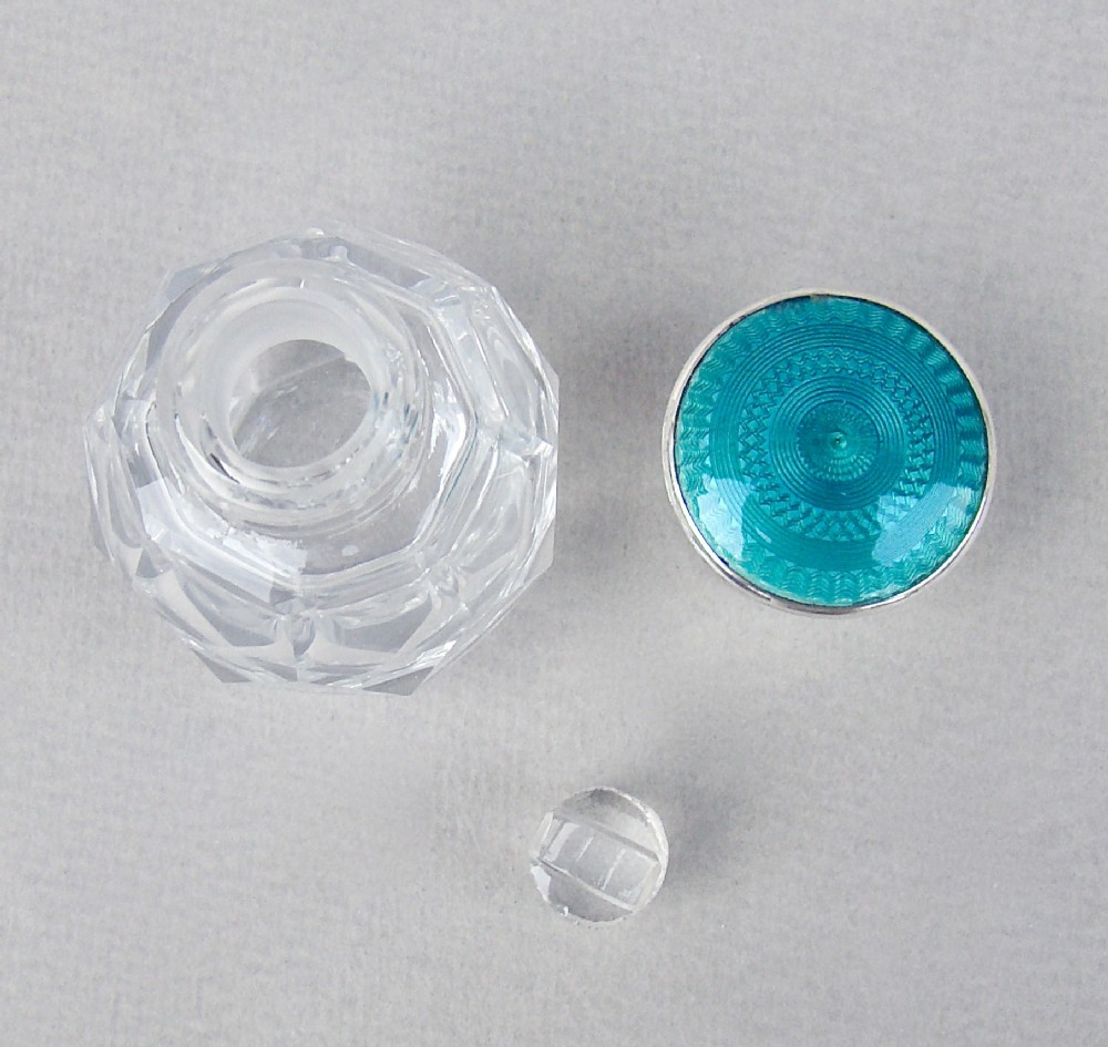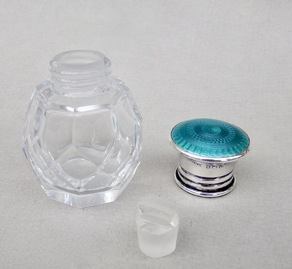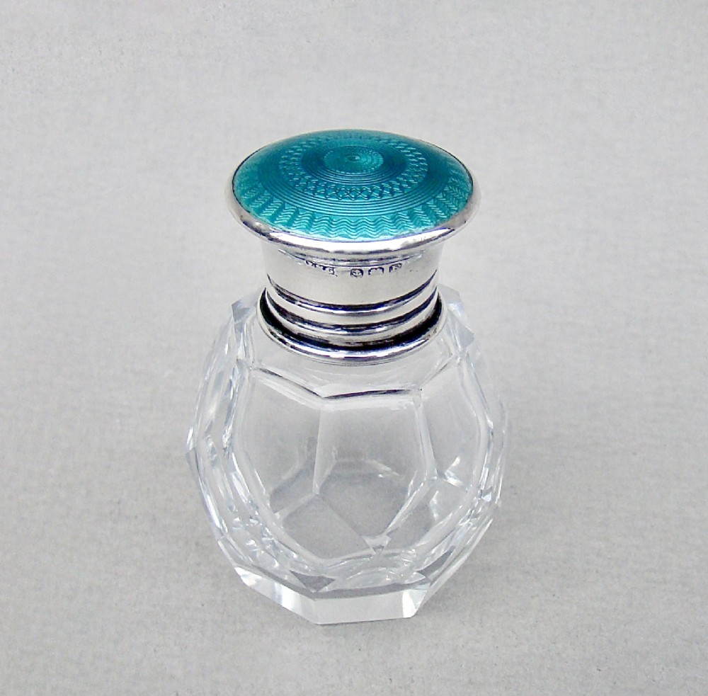 STUNNING ART DECO SILVER & GUILLOCHE ENAMEL SCENT BOTTLE BY GREENBERG & CO, BIRMINGHAM 1929