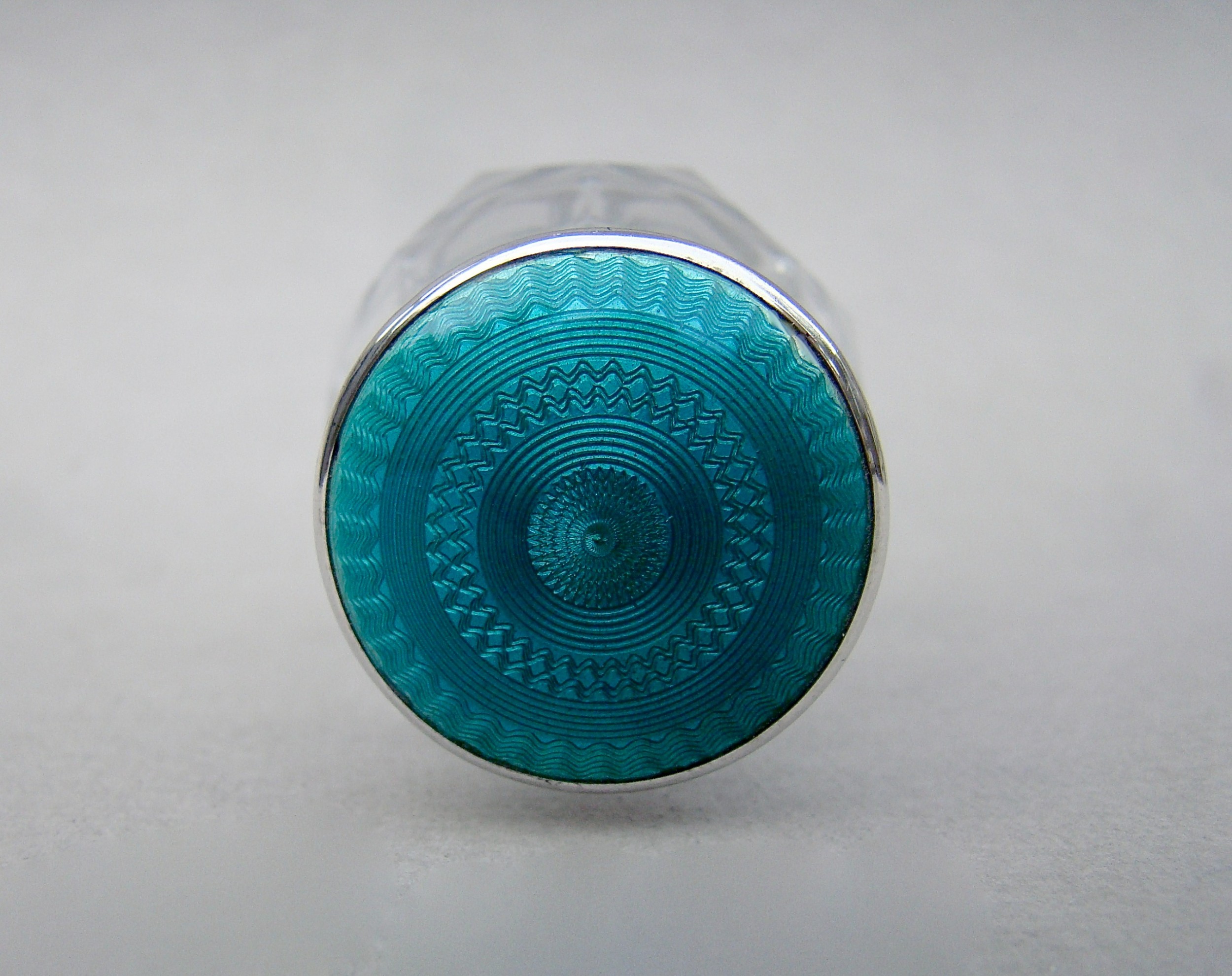 This gorgeous Art Deco silver and vivid turquoise guilloche enamel scent bottle is hallmarked for Birmingham 1929. The honeycomb cut body fitted with a silver screw top lid. The lid inset with a superb vicid turquoise enamel cabochon. The neck fitted with the original stopper. Hallmarks: I S Greenberg & Co Date letter "E" for 1929. Birmingham Assay mark. Lion passant. Dimensions: Height: 6 cm - 2.4 inches. Diameter at widest: 4cm - 1.4 inch. Condition: Very good No dings or dents to silver lid. No loss to the enamel. Glass body and glass neck in good condition. Postage: PLEASE DO NOT FORGET TO ADD POSTAGE AT CHECKOUT. Postage UK: £5 Royal Mail Tracked 24 Postage overseas: £18 International Signed For. You can pay by PayPal, bank transfer, cheque, debit or credit card. To pay by PAYPAL please add P&P and click on button below. To pay by credit or debit card over the phone or by cheque, please contact me on 01449 760 585. Internal Ref: DEC84