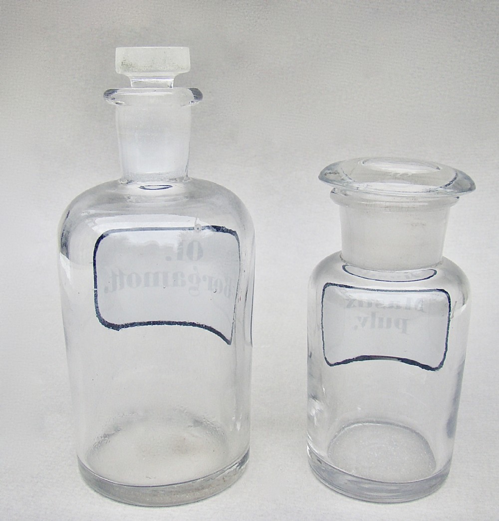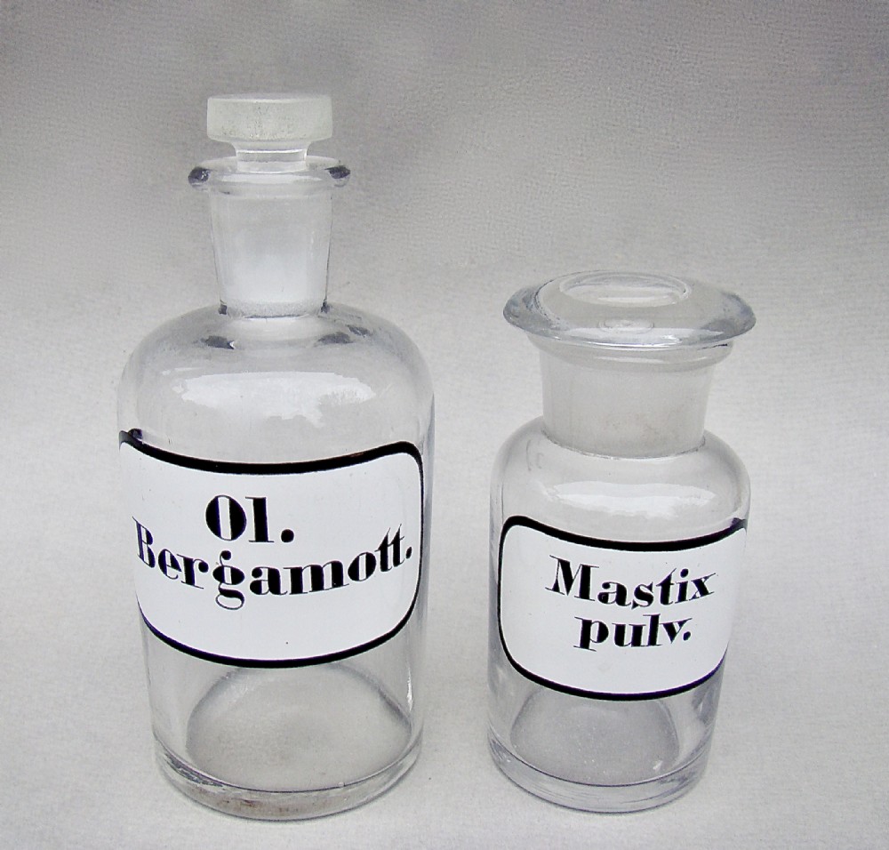 These charming small Victorian glass apothecary jars date circa 1890. Each clear glass body with a white porcelain label heightened in black.Each fitted with their original stoppers. One labelled "Mastic pulv." which refers to mastic powder, derived from the natural resin of the mastic tree. Mastic powder has been used for over 2,500 years for both culinary and health applications. The other labelled "Ol. Bergamott." which is Bergamot oil, also used for various applications.. Dimensions: Mastic Pulv: Height: 11cm / 4.2 inches. Diameter:5.5cm / 2 inches. Ol. Bergamott. Height: 14.5cm / 4.2 inches. Diameter: 8cm / 2.4 inches. Condition: Very good. Postage: PLEASE DO NOT FORGET TO ADD POSTAGE AT CHECKOUT. Postage UK: £5 Royal Mail 24 Postage overseas: £20 Standard International, You can pay by PayPal, bank transfer, cheque, debit or credit card. To pay by PAYPAL please add P&P and click on button below. To pay by credit or debit card over the phone or by cheque, please contact me on 01449 760 585. Internal Ref: DEC77