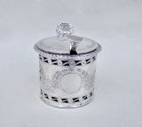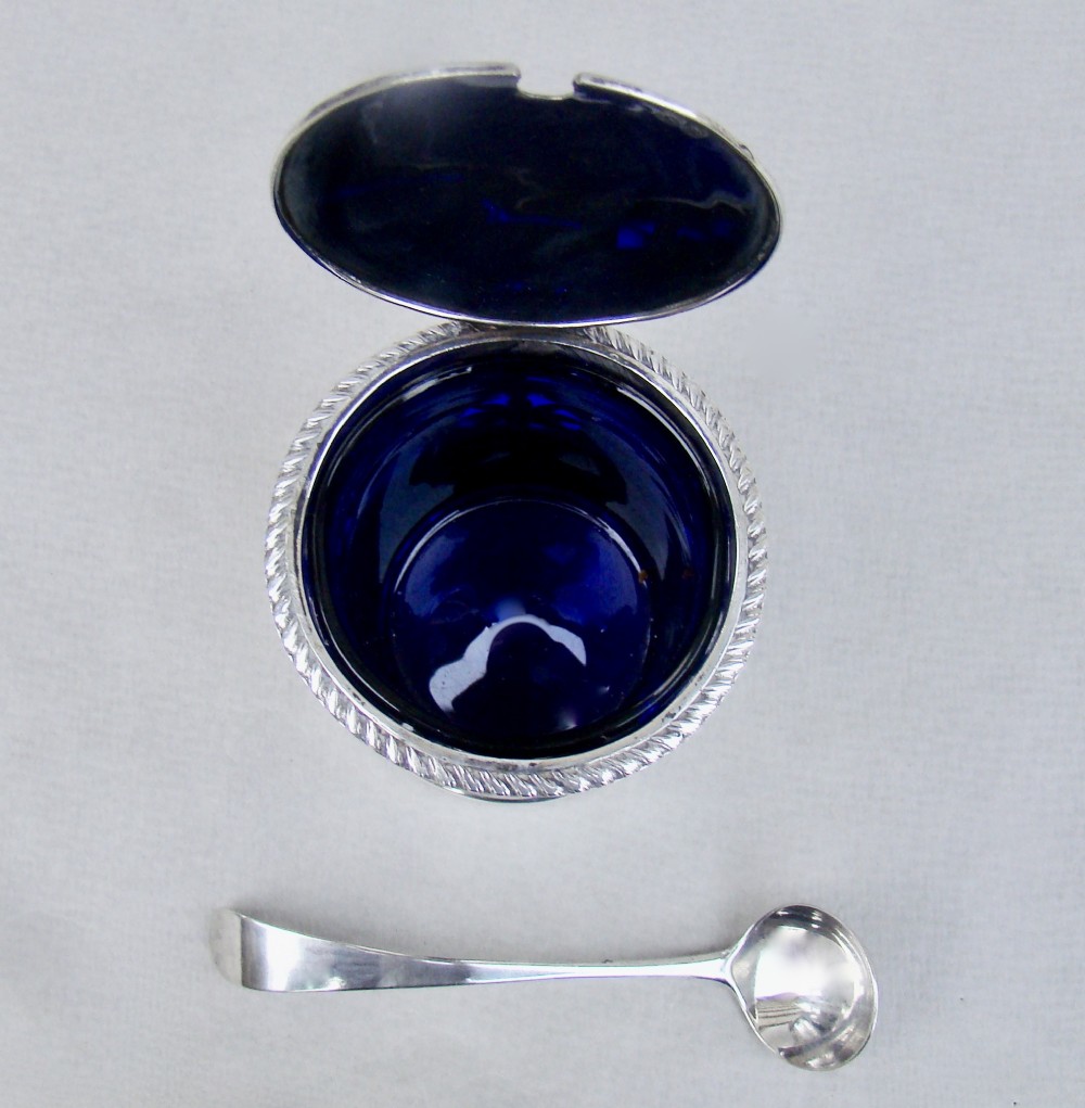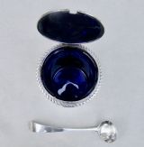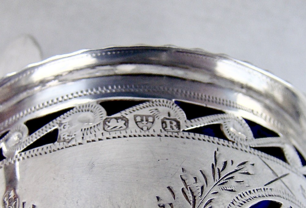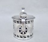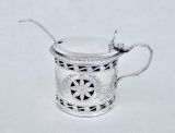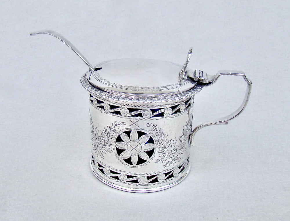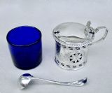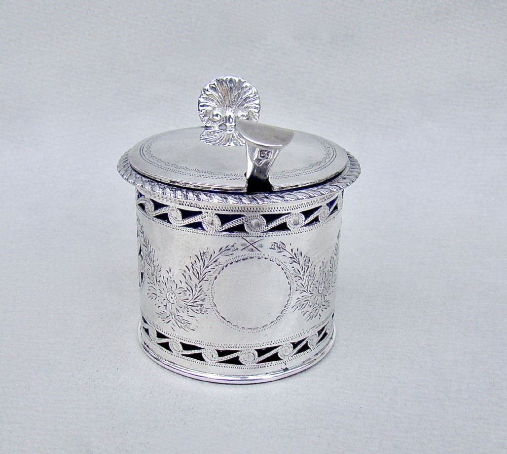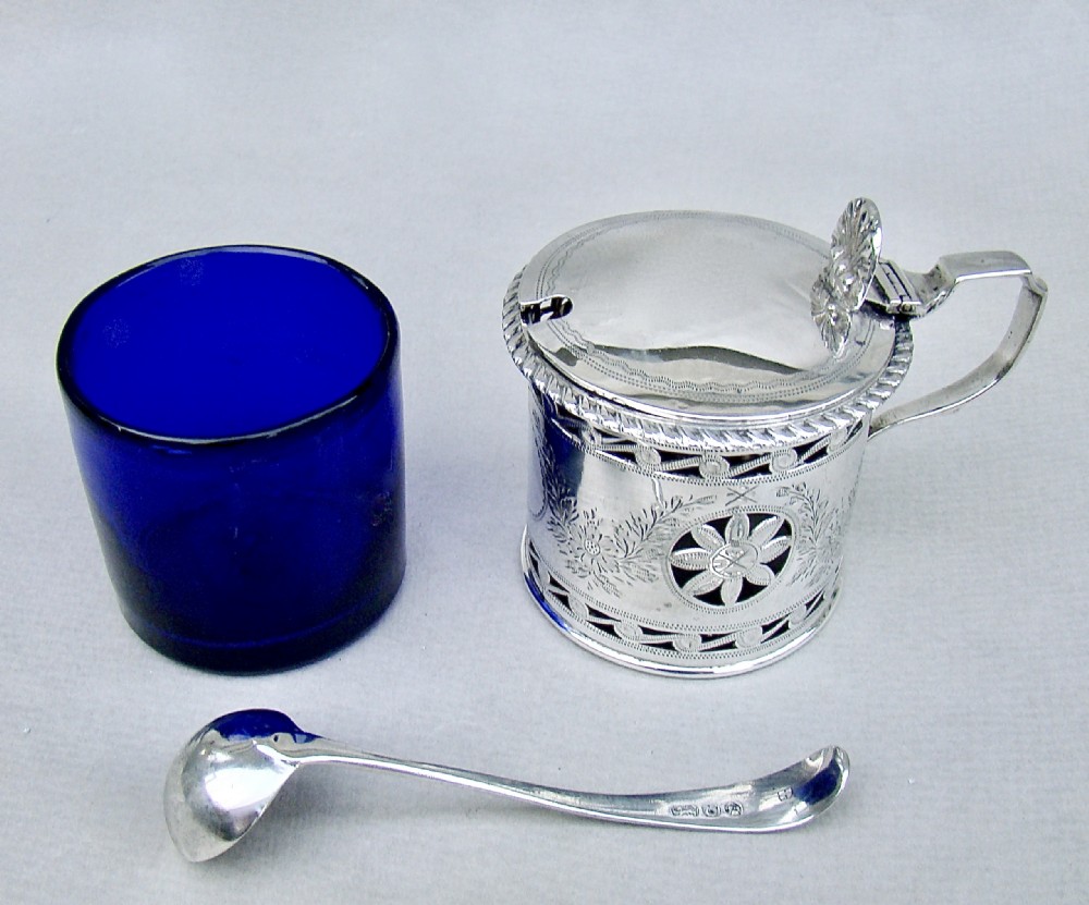 This superb quality pierced sterling silver mustard pot is hallmarked for Chester 1900 and bears the marks of the renowned Nathan & Hayes. The drum shaped body beautifully pierced and engraved with neo-classical motifs. The bright-engraved flat hinged cover with shell thumb piece. Fitted with the original blue glass liner. Sold with an associated solid silver mustard spoon dated London 1818. It is a beautiful mustard pot in crisp condition. Hallmarks: GN over RH for George Nathan & Ridley Hayes Lion Passant. Chester Assay Mark. Date letter "R" for 1900. Condition: Very good No dings or dents. No loss to the pierced decorations. Liner in perfect condition. Good hinge . Dimensions and Weight: Height up to thumbpiece: 8cm / 3.2 inches. Diameter: 6cm / 2.2 inches. Combined weight excluding liner: 105 g / 3 3/4 oz. PLEASE DO NOT FORGET TO ADD POSTAGE AT CHECKOUT. Postage UK: £5 Royal Mail Tracked 24. Postage overseas: £20 International Signed For. Postage USA (including US import duties): £45.00 You can pay by PayPal, bank transfer, cheque, debit or credit card. To pay by PAYPAL please add P&P and click on button below. To pay by credit or debit card over the phone or by cheque, please contact me on 01449 760 585. Internal Ref: DEC76