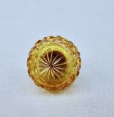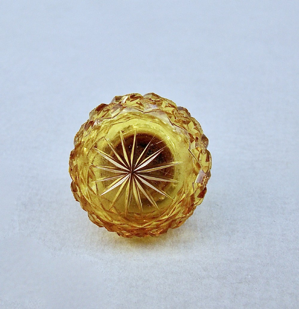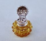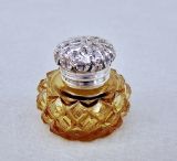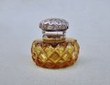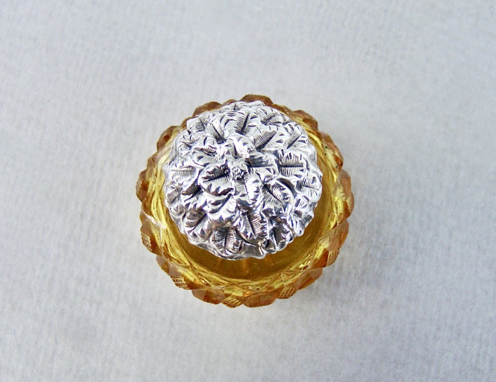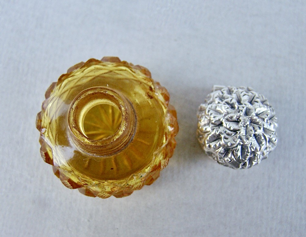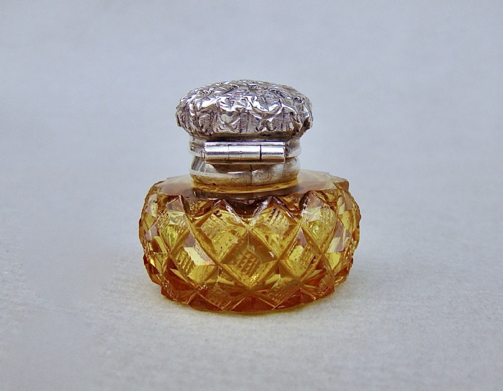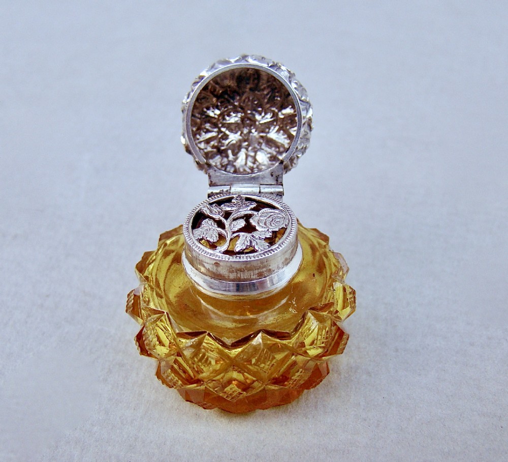 This exquisite and rare small silver mounted vinaigrette has a sliced-cut amber glass body The screw-top silver hinged lid opening to reveal an exquisite grille pierced with a rambling rose. It is charmingly embossed. the base star-incised.