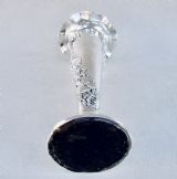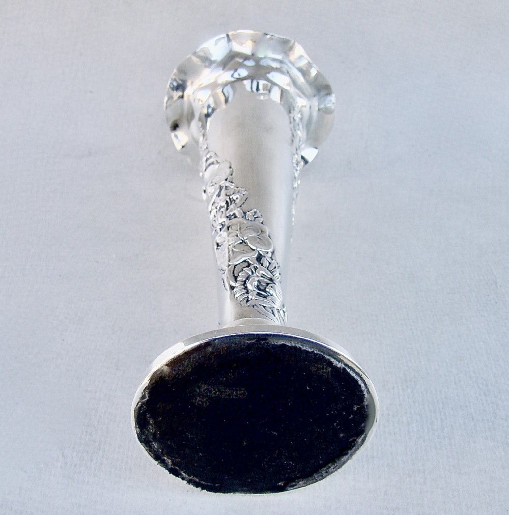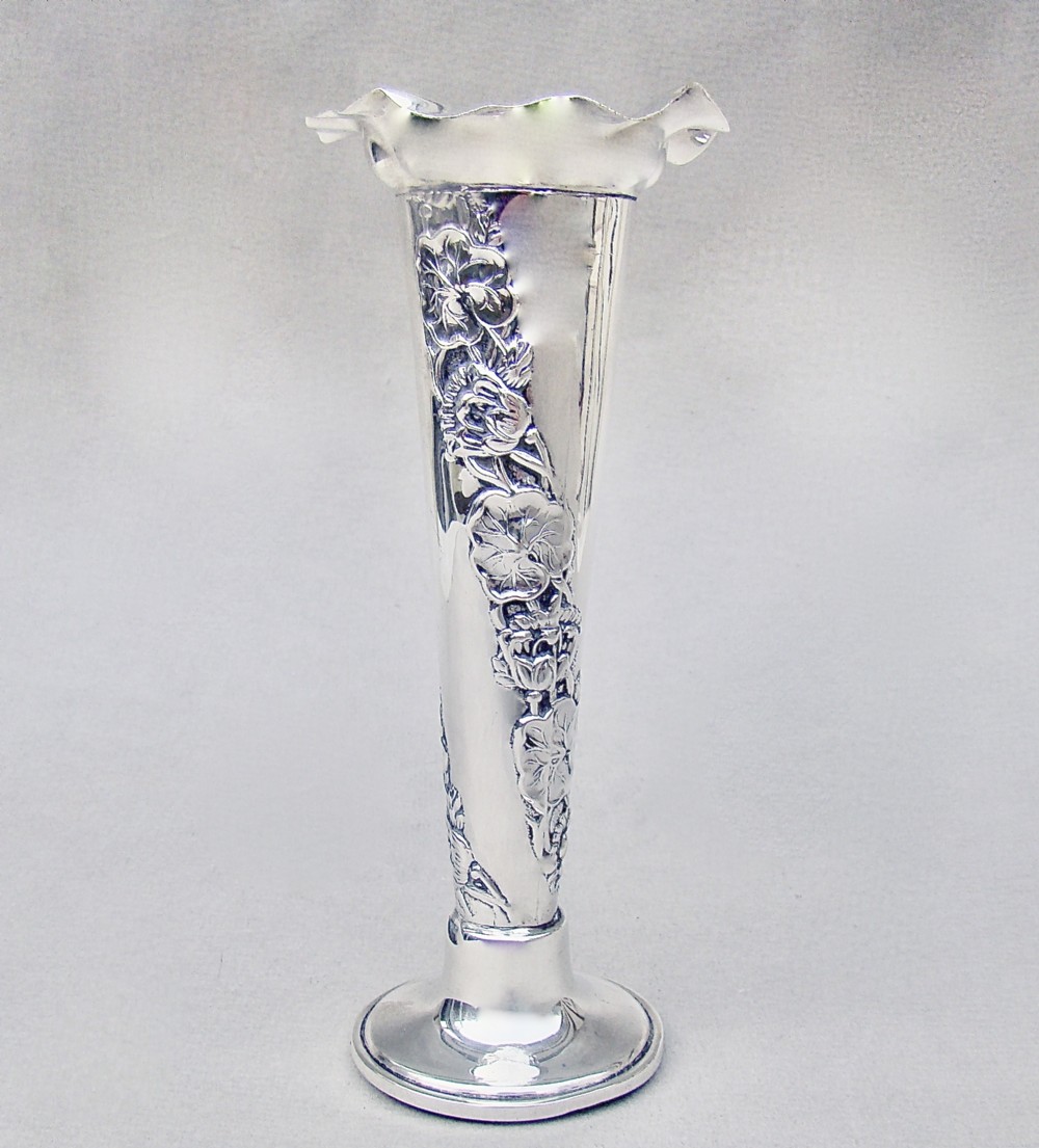 This beautiful Edwardian silver vase bears the mark of the renowned Sampson Mordan & Co and is dated London 1902. The cylindrical flared stem with embossed floral garlands leading to a pinched rim and raised upon a circular stepped base. The base loaded. The underside lined with black Morocco leather.