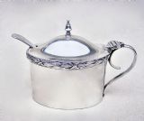 This very elegant sterling silver mustard pot is dated Birmingham 1910 and was made by the sought-after silversmith William Hutton. Of traditional oval form , the plain sides with a distinctive rope-twist border, giving it an Arts & Craft look. The domed cover with urn shaped finial. The back with elegant scroll handle. Fitted with the original blue glass liner and sold with a very well matched sterling silver mustard spoon by John Round, dated Sheffield 1909.