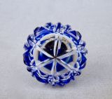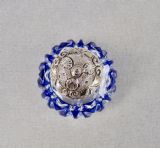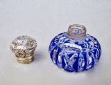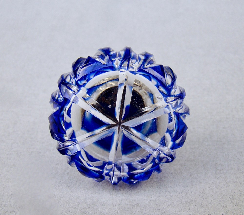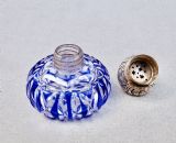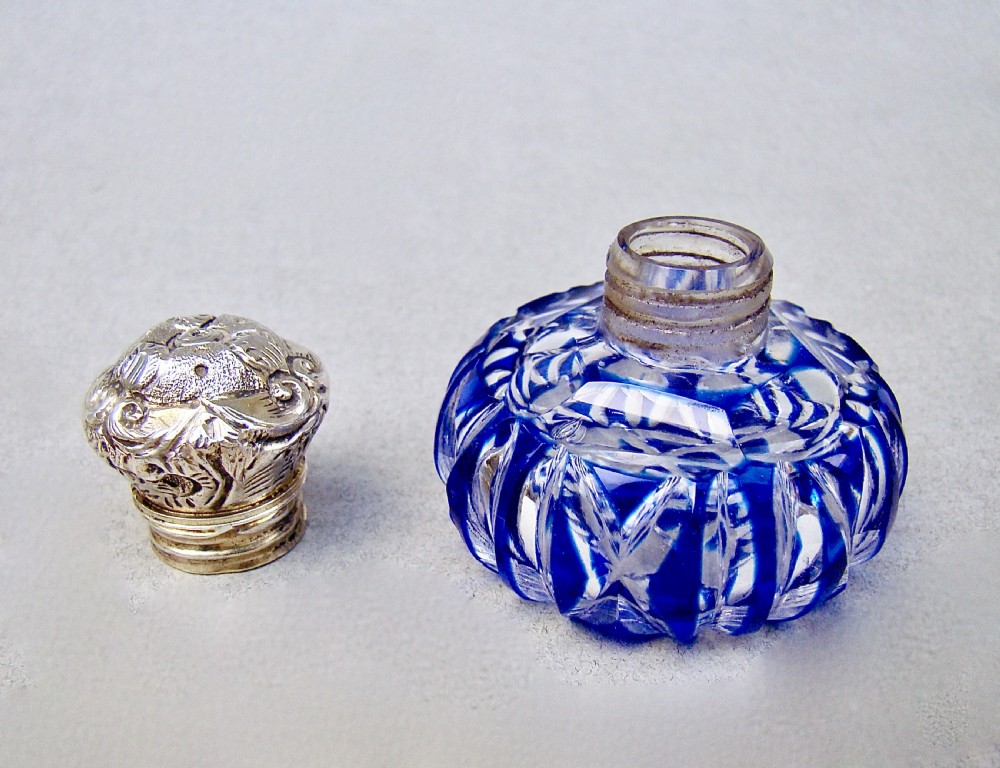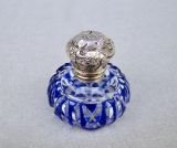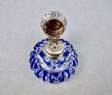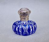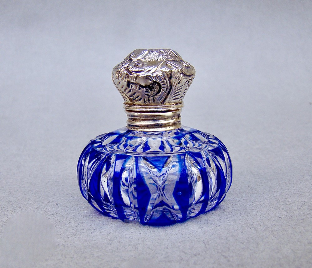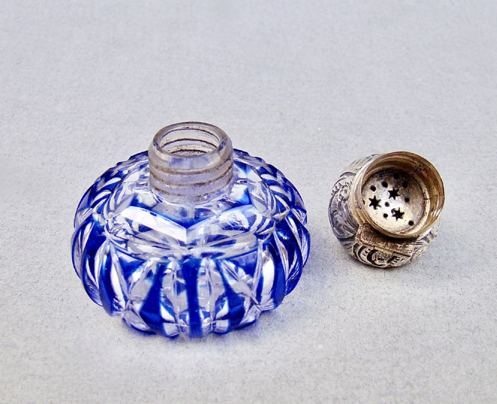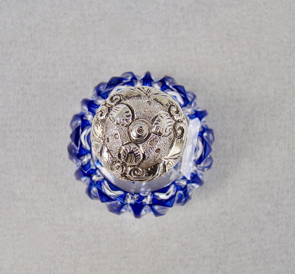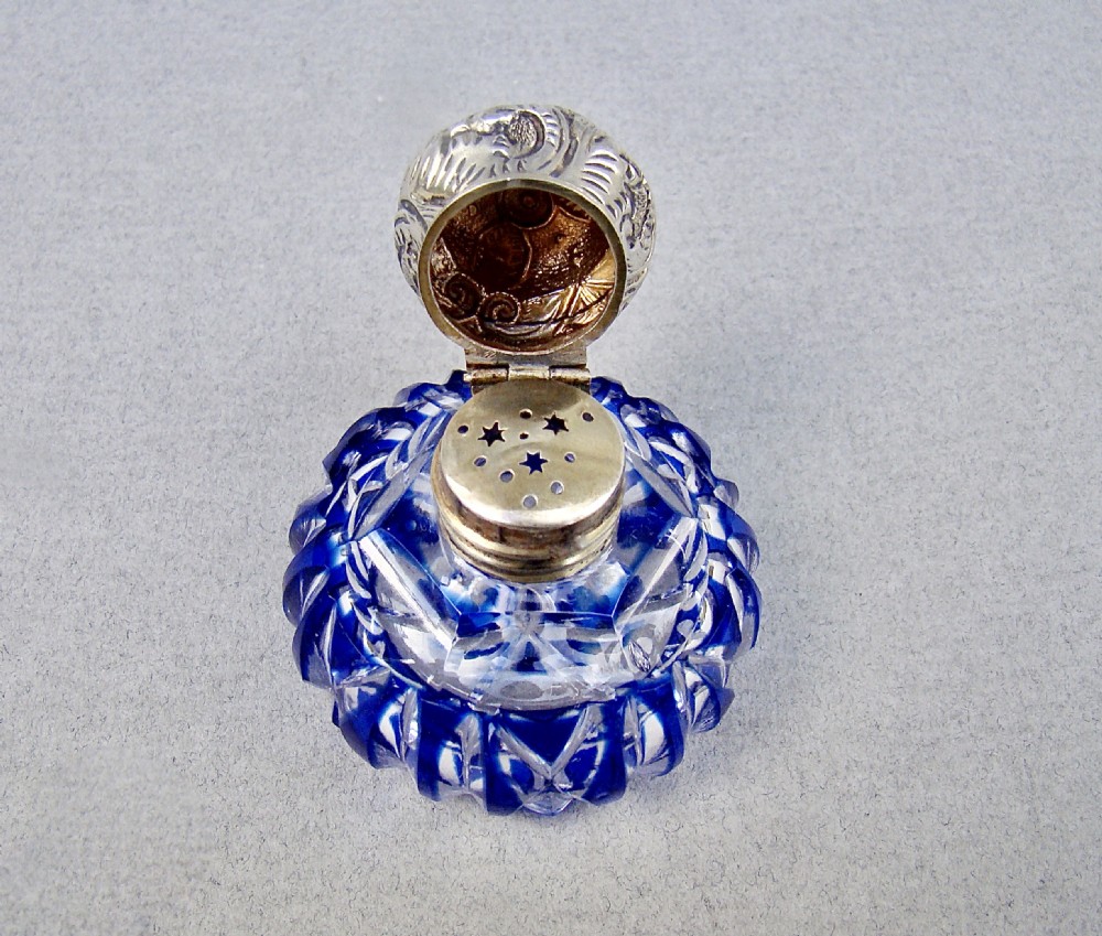 This exquisite and rare silver mounted vinaigrette has a sliced-cut Bristol blue glass body. The screw-top silver hinged lid opening to reveal an exquisite grille pierced with stars. The base star-cut.