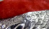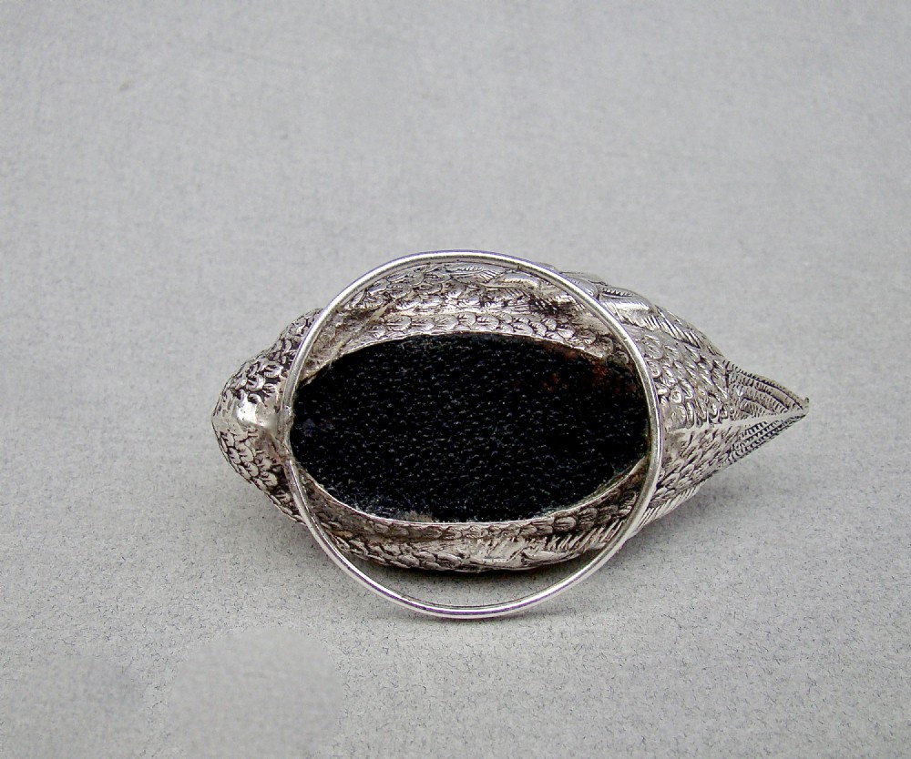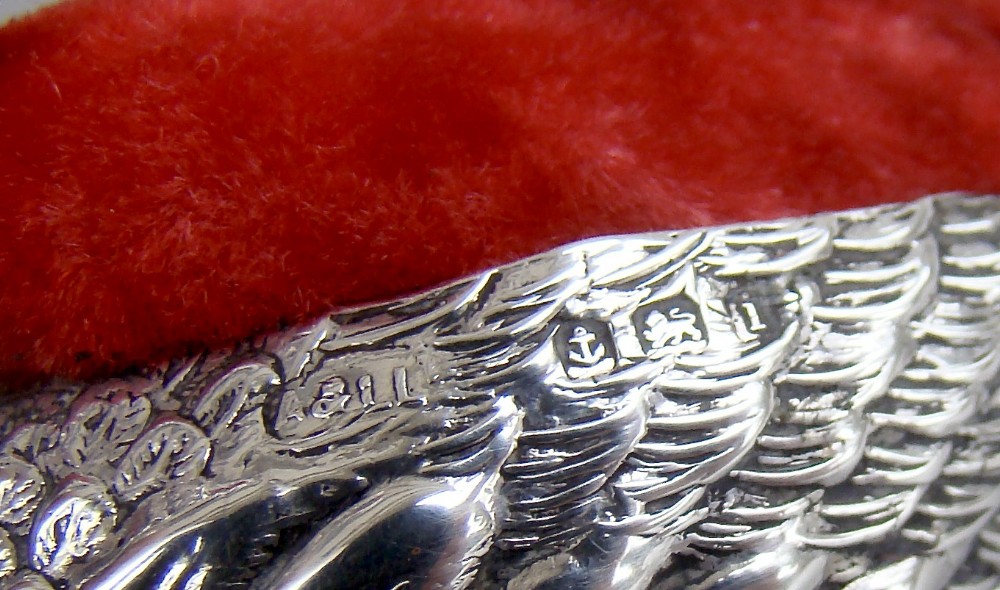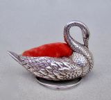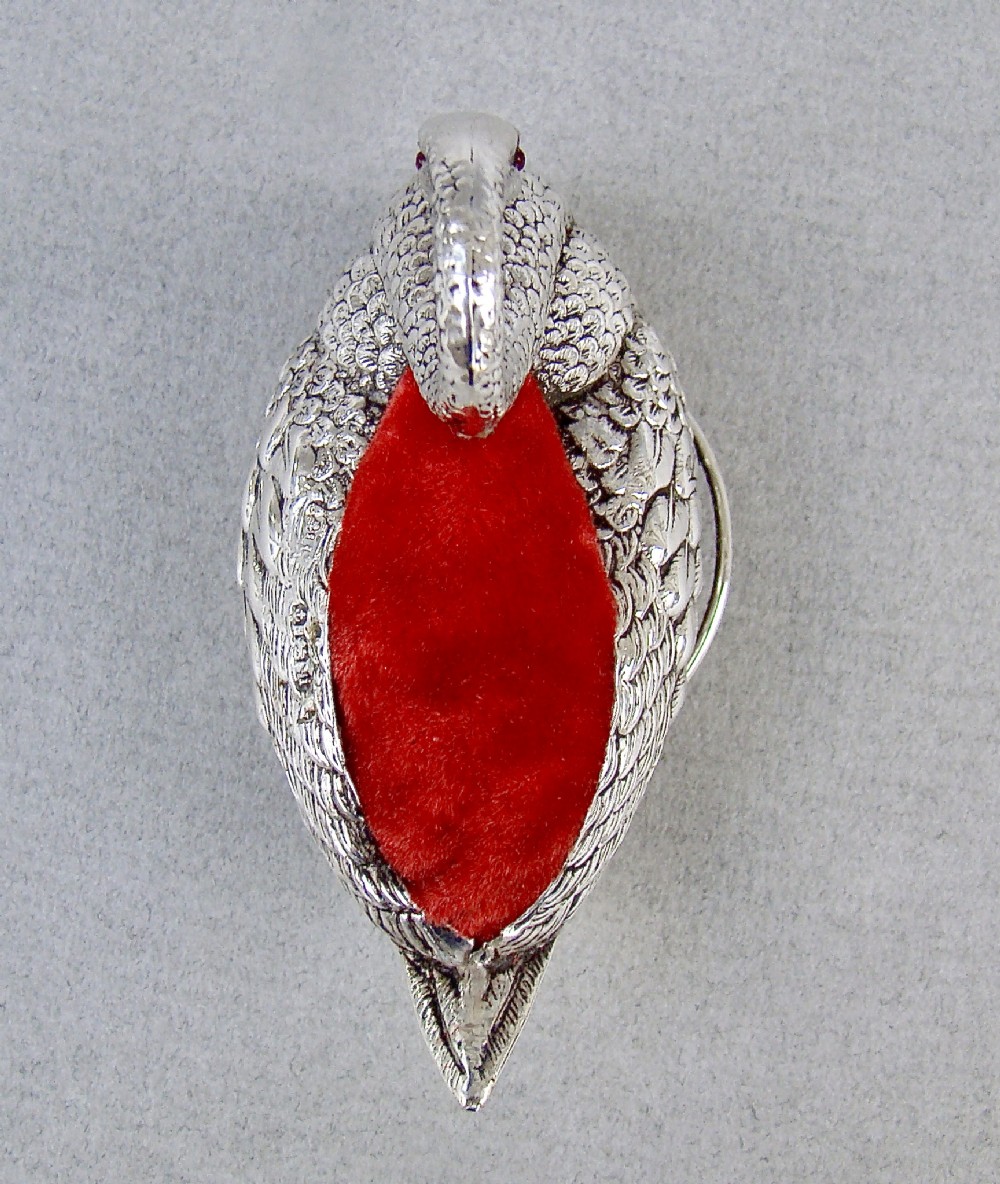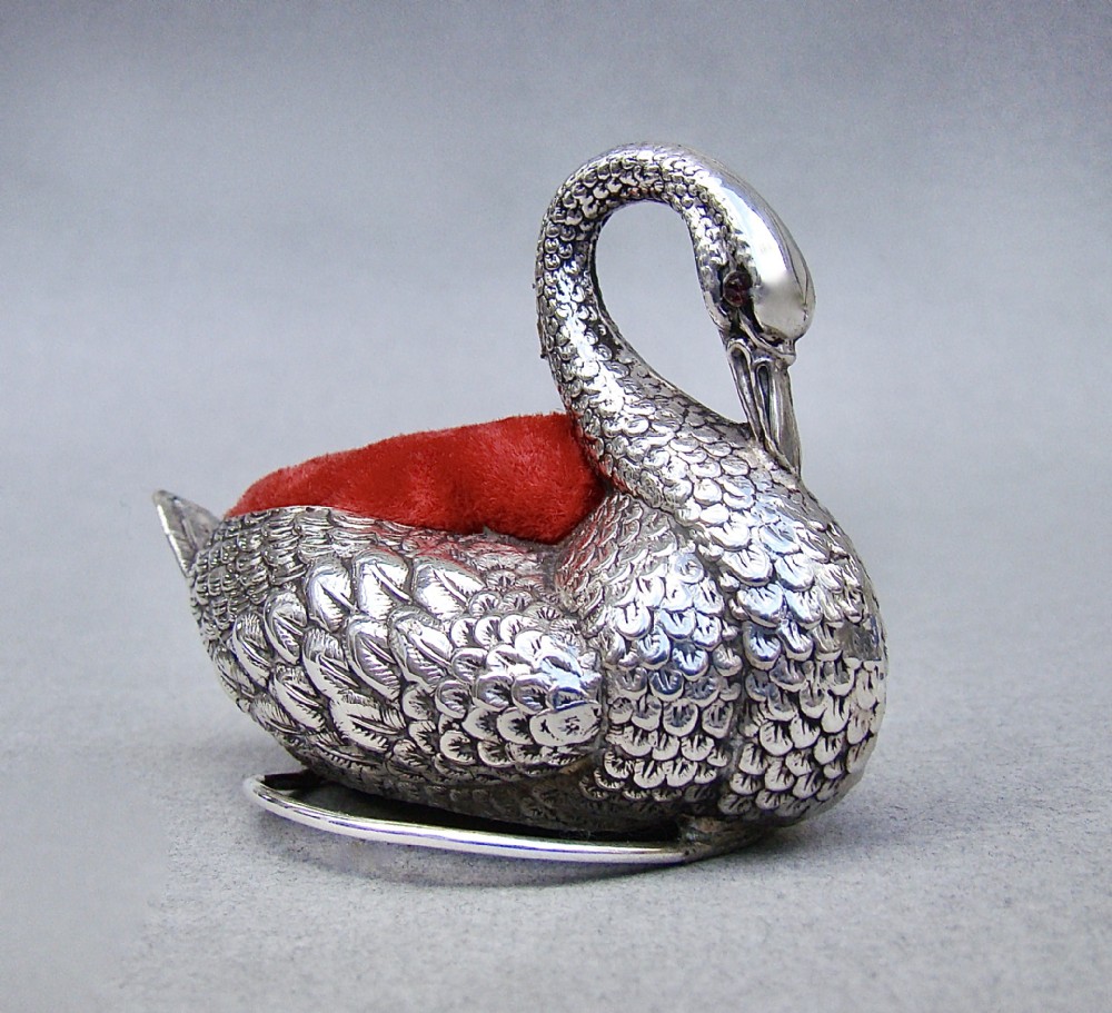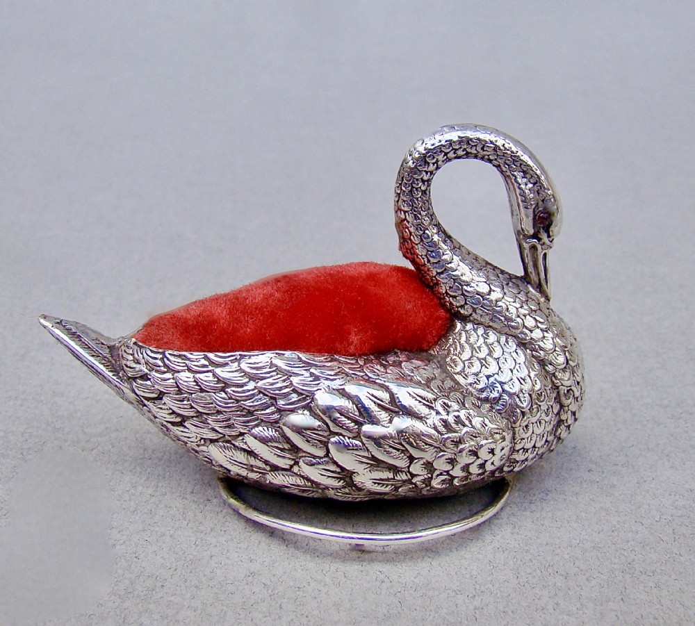 This delightful and very unusual Edwardian silver swan pin cushion bears the marks of Adie & Lovekin and is dated Birmingham 1908. The body with detailed plumage rests on a circular silver ring. The eyes inset with ruby stones, a rare and exquisite detail. The original cushion finished in red velvet. The underside with black Morocco leather. Hallmarks: AL&L for Adie & Lovekin. Birmingham Assay Mark. Lion Passant. Date letter "i" for 1908. Condition: Very good. Body in excellent condition. Dimensions: Length: 7.5cm / 3 inches. Height: 4.5cm / 1.6 inches. Width: 4cm / 1.4 inches. PLEASE DO NOT FORGET TO ADD POSTAGE AT CHECKOUT. Postage UK: £5 Royal Mail Tracked 24. Postage overseas: £20 International Signed For. Postage USA (including US import duties): £45.00 You can pay by PayPal, bank transfer, cheque, debit or credit card. To pay by PAYPAL please add P&P and click on button below. To pay by credit or debit card over the phone or by cheque, please contact me on 01449 760 585. Internal Ref: JANV87