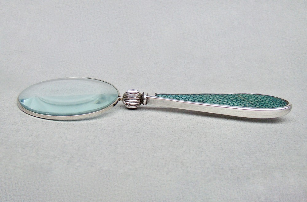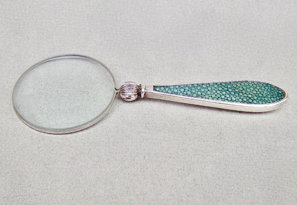 UNUSUAL ART DECO SILVER & SHAGREEN SMALL MAGNIFYING GLASS BY MAPPIN & WEBB, BIRMINGHAM 1928