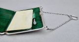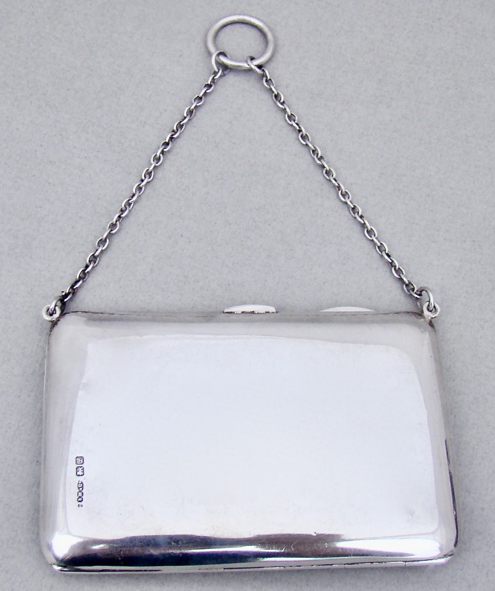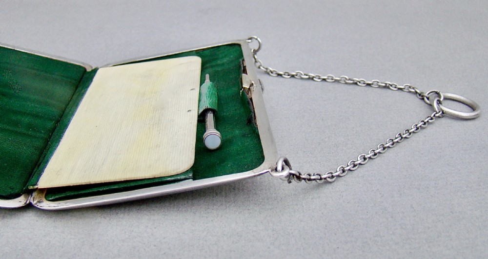 This simple and elegant silver aide memoire is dated Chester 1912 and was made by the renowned Sampson Mordan & Co. Of rounded rectangular form, the plain front with chain attachment and finger ring. The interior lined with the original green moire silk including an ivory coloured notepad and a silver propelling pencil with agate terminal. The back plain and fully hallmarked.