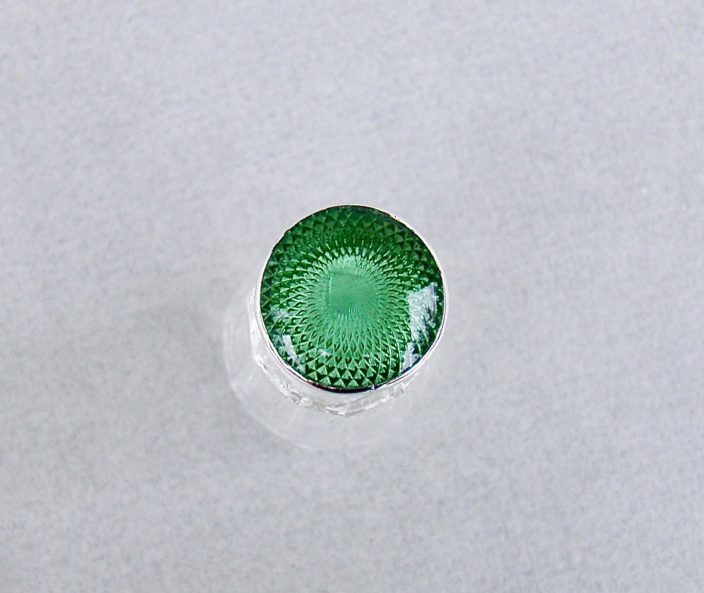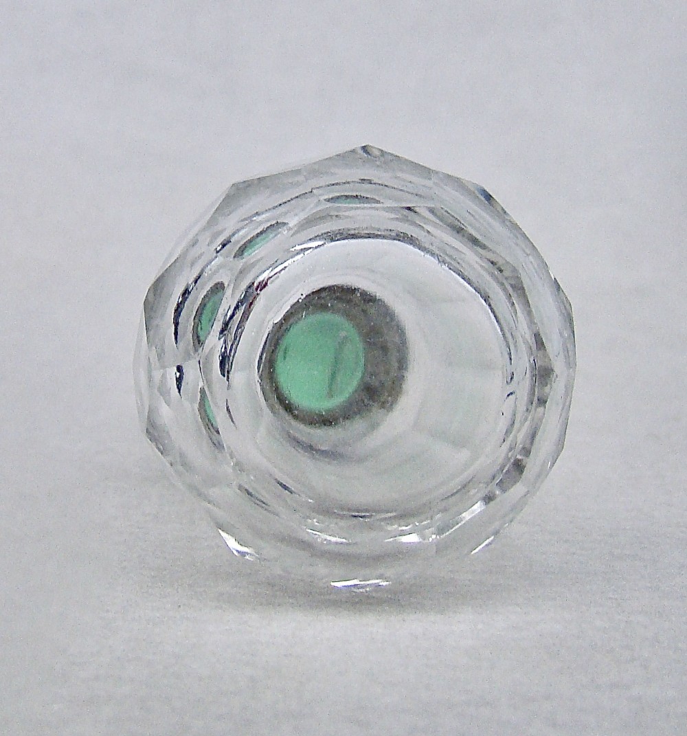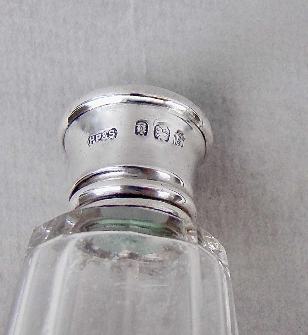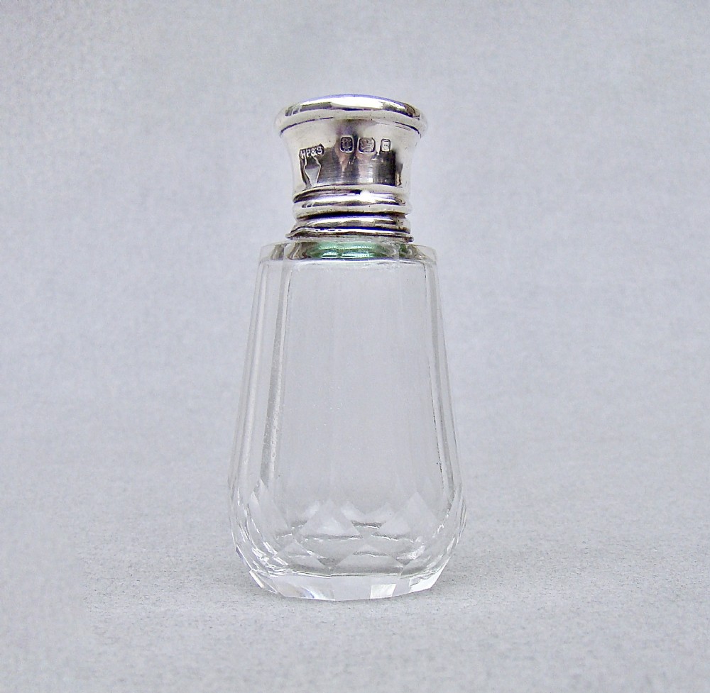 This unusual and rather elegant small Art Deco silver scent bottle is hallmarked for London 1921 and bears the marks of Henry Perkins & Sons. The panelled glass body fitted with a silver screw top lid. The lid inset with a vibrant green, sunburst pattern, glass cabochon. The neck with clear glass stopper. Hallmarks:- HP&S by Henry Perkins & Sons. Date letter "f" for 1921. London Assay mark. Lion passant. Dimensions: Height: 6cm / 2.3 inches. Diameter: 3cm / 1.2 inches. Condition: Very good. Glass body, neck and stopper in good condition, no cracks. Screw top lid secure. Postage: PLEASE DO NOT FORGET TO ADD POSTAGE AT CHECKOUT. Postage UK: £5 Royal Mail Tracked 24. Postage overseas: £20 International Signed For. Postage USA (including US import duties): £45.00 You can pay by PayPal, bank transfer, cheque, debit or credit card. To pay by PAYPAL please add P&P and click on button below. To pay by credit or debit card over the phone or by cheque, please contact me on 01449 760 585 Internal Ref: FEB87