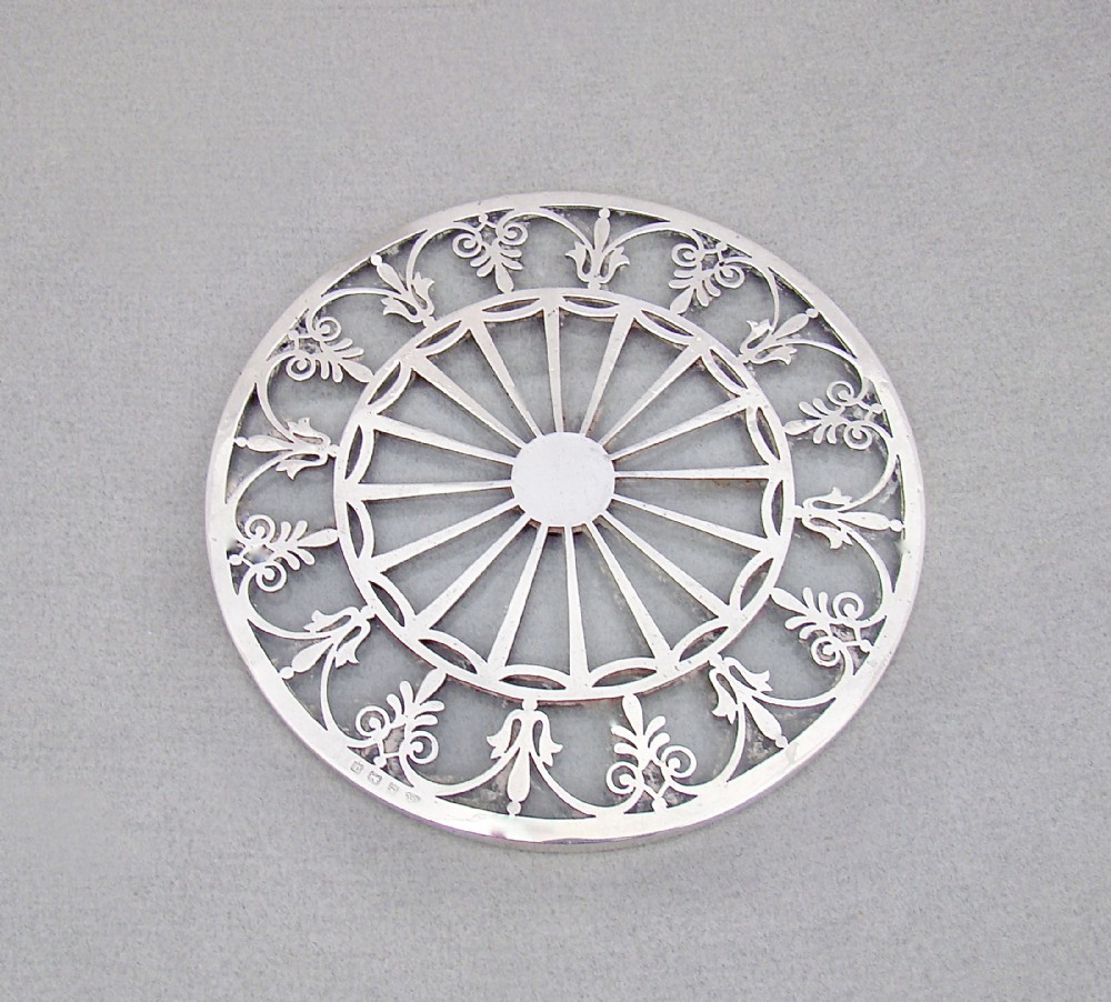 This elegant and decorative silver and glass teapot stand is dated Birmingham 1933. The toughened glass circular stand mounted with a solid silver lattice mount. Hallmarks: A Bros for the Adie Brothers. Birmingham Assay Mark. Date letter "J" for 1933. Lion Passant. Dimensions: Diameter: 12.5cm / 5 inches. Condition: Good Glass in very good condition. Silver mount with no loss. Centre with a slight spring. PLEASE DO NOT FORGET TO ADD POSTAGE AT CHECKOUT. Postage UK: £5 Royal Mail Tracked 24. Postage overseas: £20 International Signed For. Postage USA (including US import duties): £45.00 You can pay by PayPal, bank transfer, cheque, debit or credit card. To pay by PAYPAL please add P&P and click on button below. To pay by credit or debit card over the phone or by cheque, please contact me on 01449 760 585. Internal Ref: FEV77