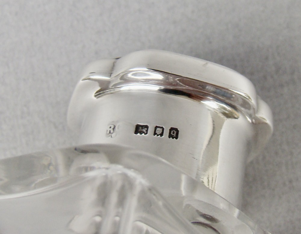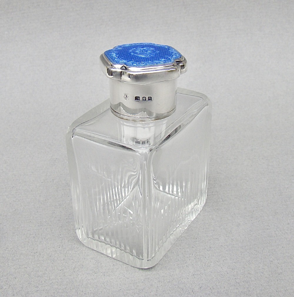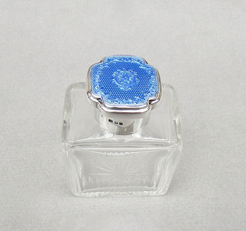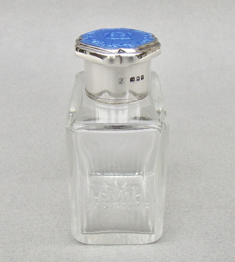 ART DECO SILVER & GUILLOCHE ENAMEL SCENT BOTTLE BY RICHARD COMYNS, LONDON 1931