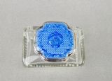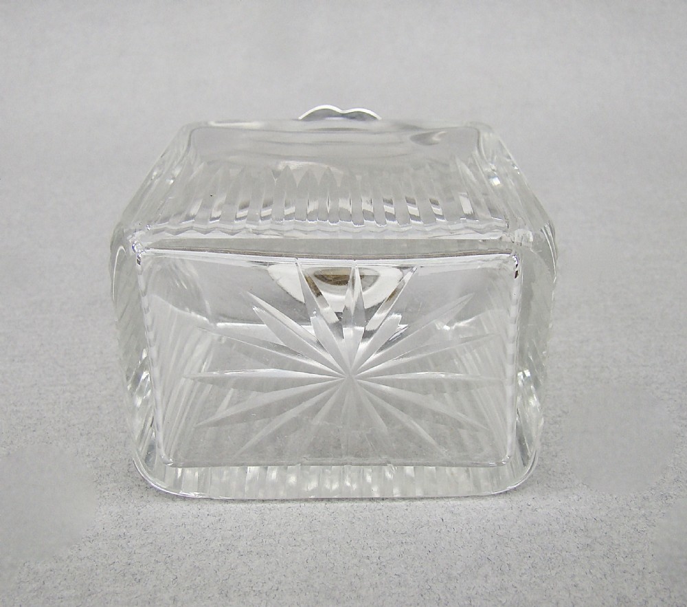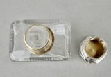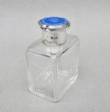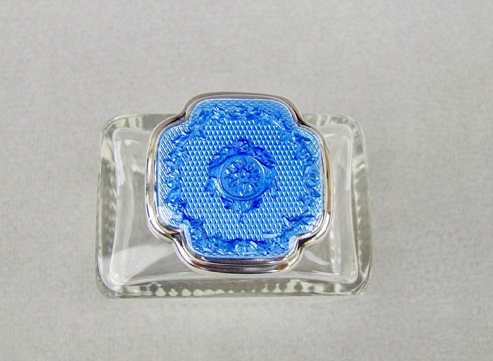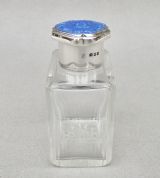This fabulous silver and blue guilloche enamel scent bottle is dated London 1931 and was made by the celebrated Richard Comyns. The sliced-cut rectangular glass body fitted with a shaped silver screw-top lid. The lid inset with a vivid blue enamel cabochon decorated with floral garlands. The inner lid with a rich gilt interior. The neck with clear glass stopper. The base star-incised.