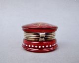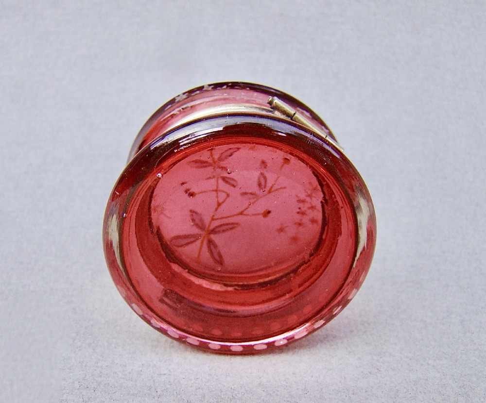 This is a gorgeous trinket box originating from France and dating circa 1890. The brass bound hinged cranberry glass lid beautifully decorated with a gilt and white enamel foliate spray. The sides heightened with white enamel dots. Dimensions: Diameter: 4.5cm / 1.6 inches. Height: 2.5cm / 1 inch. Condition: Very good. No damage to the glass. Gilt decorations in good order. Delivery: PLEASE DO NOT FORGET TO ADD POSTAGE AT CHECKOUT. Postage UK: £5 Royal Mail Tracked 24. Postage overseas: £15 International Signed For. Postage USA (including US import duties): £30.00 You can pay by PayPal, bank transfer, cheque, debit or credit card. To pay by PAYPAL please add P&P and click on button below. To pay by credit or debit card over the phone or by cheque, please contact me on 01449 760 585. Internal Ref: MAR96