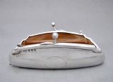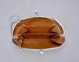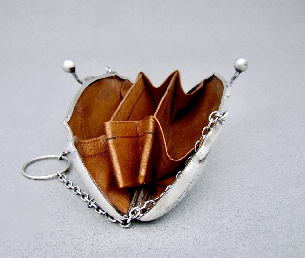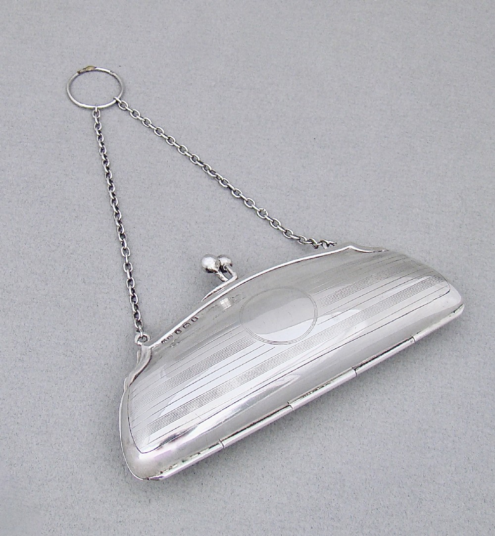 This stylish sterling silver cocktail purse was made in Birmingham in 1917 and bears the marks of G. Norman. The front and back engraved with elegant engine-turned decorations. The front with a vacant roundel. The clasp opening to reveal the original tan leather interior. The sides fitted with a chain and suspension ring to allow a lady to hold her purse while dancing or holding her cocktail glass. Hallmarks: G.N for G. Norman. Birmingham Assay Mark. Lion Passant. Date letter "s" for 1917. Dimensions: Maximum width: 12.5cm / 5 inches. Maximum depth: 2.5cm / 1 inch. Height: 6.5cm / 2.3 inches. Condition: Very good condition. Good hinge, snaps shut. Crisp engravings. Clean Interior. Delivery: PLEASE DO NOT FORGET TO ADD POSTAGE AT CHECKOUT. Postage UK: £5 Royal Mail Tracked 24. Postage overseas: £20 International Signed For. Postage USA (including US import duties): £45.00 You can pay by PayPal, bank transfer, cheque, debit or credit card. To pay by PAYPAL please add P&P and click on button below. To pay by credit or debit card over the phone or by cheque, please contact me on 01449 760 585. Internal Ref: MAR94