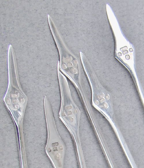 This is a very unusual and rather fun set of six Art Deco silver and bakelite "cherry" cocktail sticks presented in a silver mounted miniature pedestal holder. The hallmarked silver pedestal base with a glass flower-shaped holder. The Art Deco sterling silver cocktail sticks with Bakelite cherry finial tops are dated London 1934 and bear the hallmarks of the prolific Emile Viner. Hallmarks holder: I..S.G. for I S Greenberg. Birmingham Assay Mark. Lion Passant. Date letter "n" for 1912. Hallmarks sticks: E.V for Emile Viner. Date letter "t" for 1934. Jubilee Mark. Lion Passant. London Assay Mark. Dimensions: Vase height: 8.5cm / 3.3 inches. Base diameter: 4cm / 1.4 inches. Cherry sticks: Length: 8.5cm / 3.2 inches. Condition: Very good. Delivery: PLEASE DO NOT FORGET TO ADD POSTAGE AT CHECKOUT. Postage UK: £5 Royal Mail Tracked 24. Postage overseas: £20 International Signed For. Postage USA (including US import duties): £45.00 You can pay by PayPal, bank transfer, cheque, debit or credit card. To pay by PAYPAL please add P&P and click on button below. To pay by credit or debit card over the phone or by cheque, please contact me on 01449 760 585. Internal Ref: MAR93