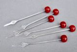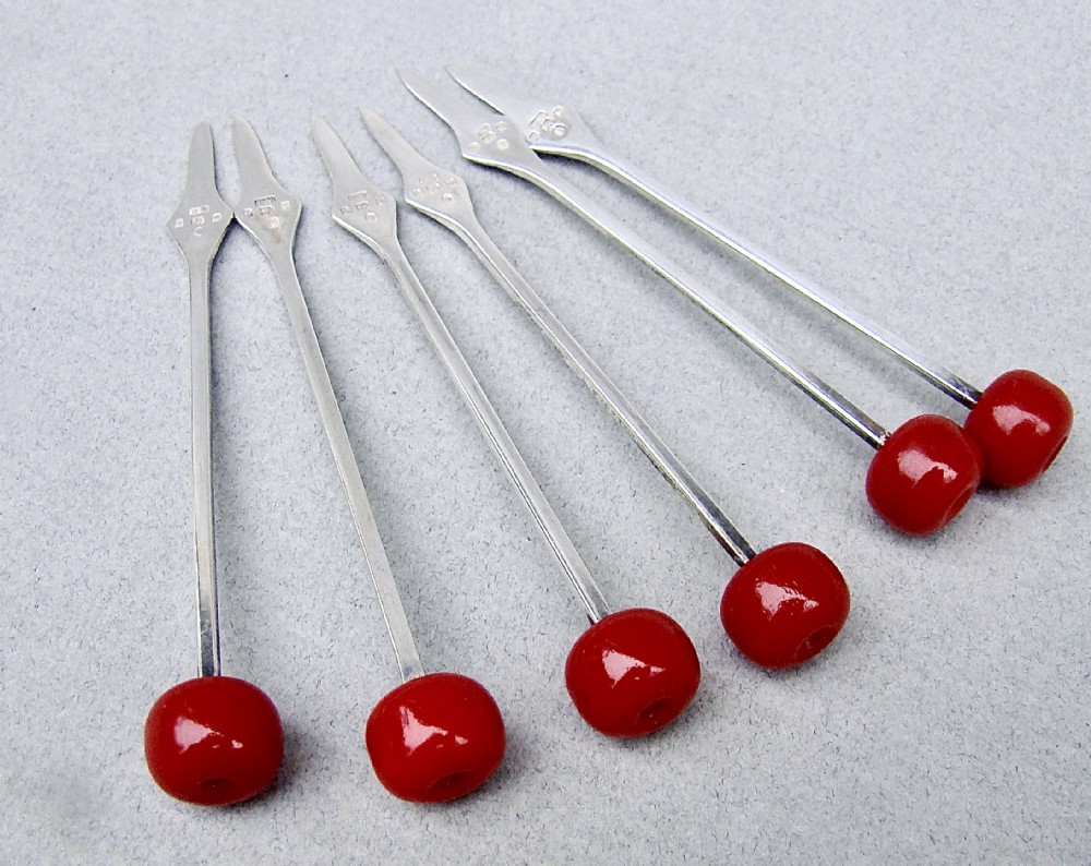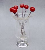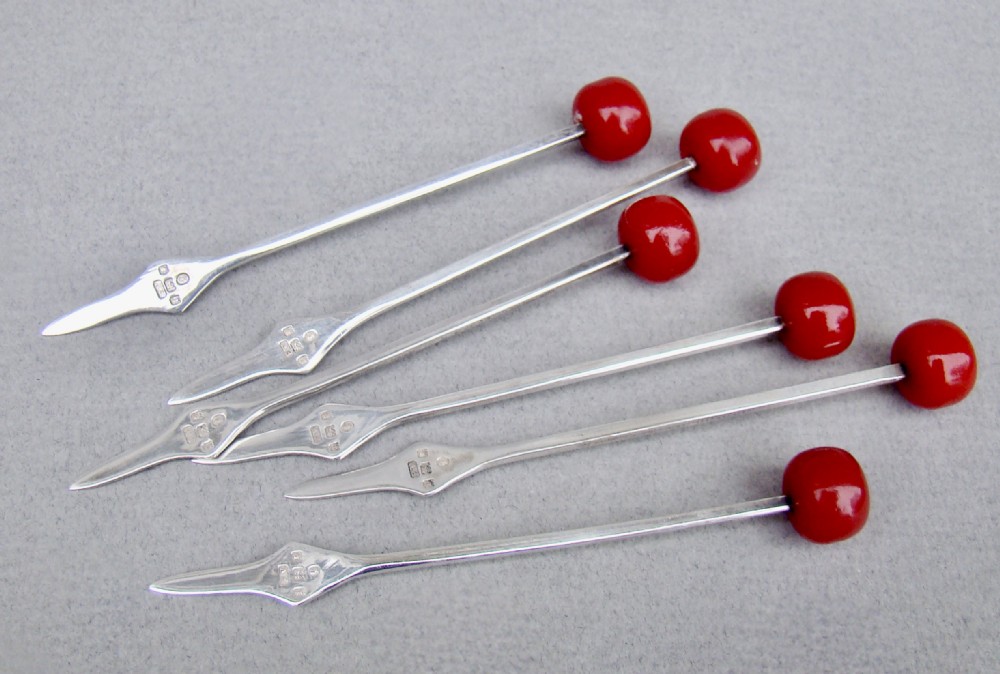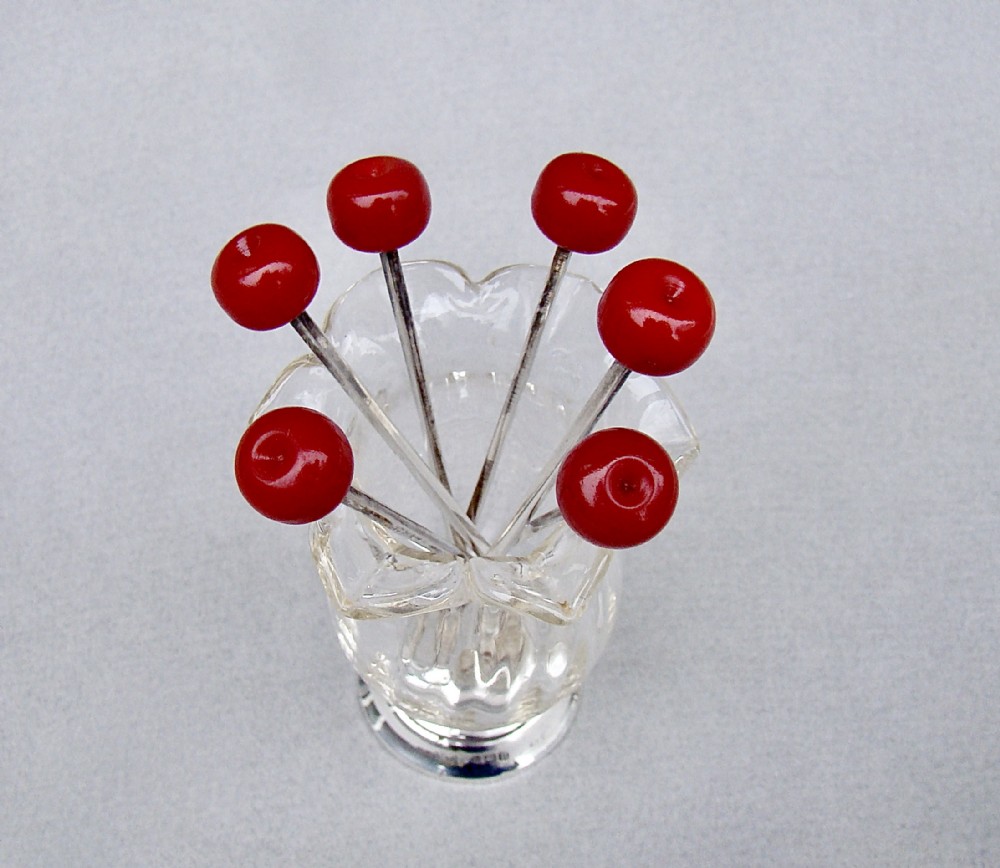 RARE SET OF SIX ART DECO SILVER "CHERRY" COCKTAIL STICKS, LONDON 1934, IN SILVER AND CUT GLASS HOLDER