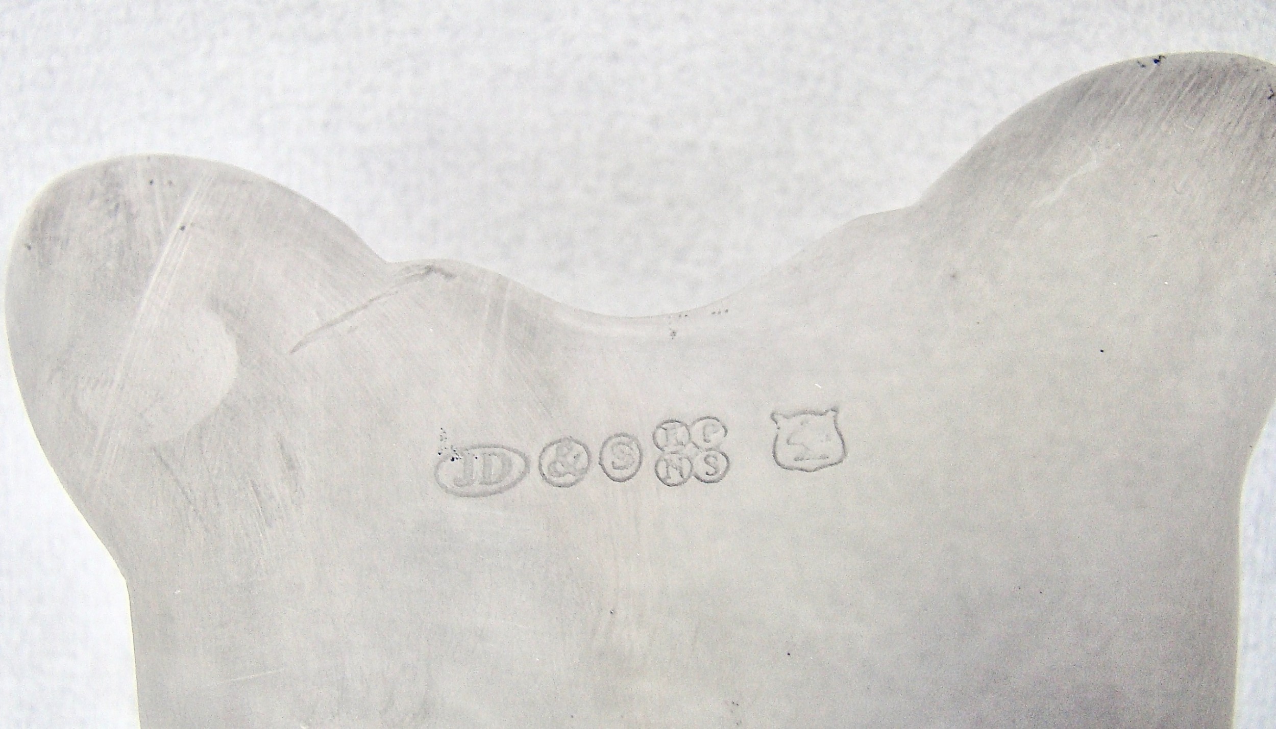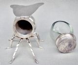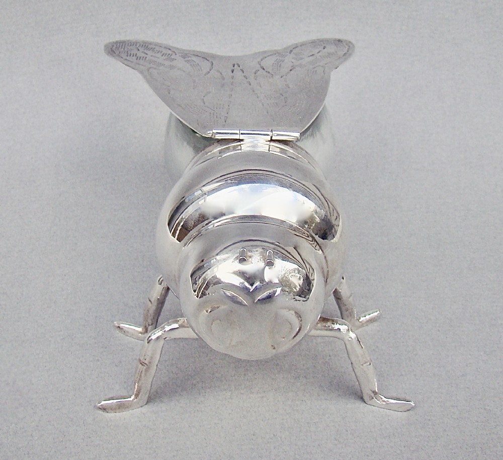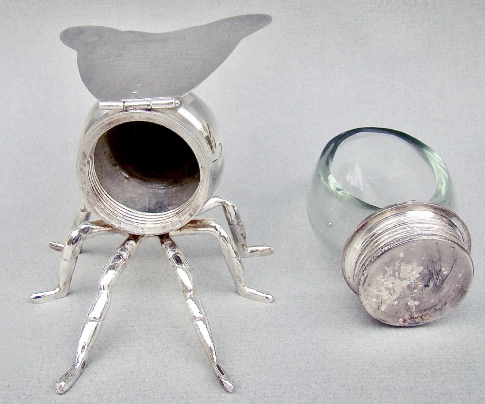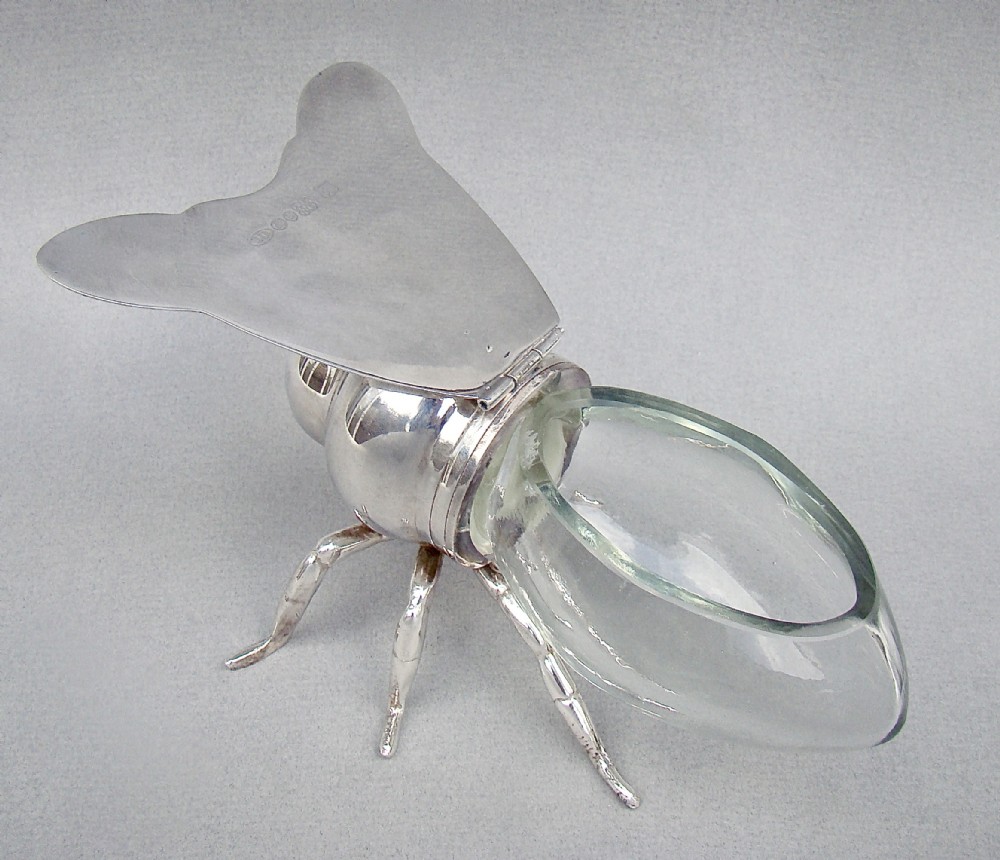 This is a very desirable and highly collectable antique silver plated honey bee pot by the renowned James Dixon & Sons. The ovoid clear glass body with a screw-top, allowing the jar to be removed easily for cleaning purposes. The silver plated body with naturalistic legs, the bee with a friendly face. The engraved wings with a hinge. The inner wings fully hallmarked for James Dixon and Sons. Electroplated Hallmarks: JD&S for James Dixon & Sons. EPNS. Pictogram of a tree. Dimensions: Height: 8.5cm / 3.2 inches. Length: 17cm / 6.2 inches. Wing span: 9.5cm / 3.6 inches. Delivery: PLEASE DO NOT FORGET TO ADD POSTAGE AT CHECKOUT. Postage UK: £5 Royal Mail Tracked 24. Postage overseas: £25 International Signed For. Postage USA (including US import duties): £45.00 You can pay by PayPal, bank transfer, cheque, debit or credit card. To pay by PAYPAL please add P&P and click on button below. To pay by credit or debit card over the phone or by cheque, please contact me on 01449 760 585. Internal Ref: MAR90