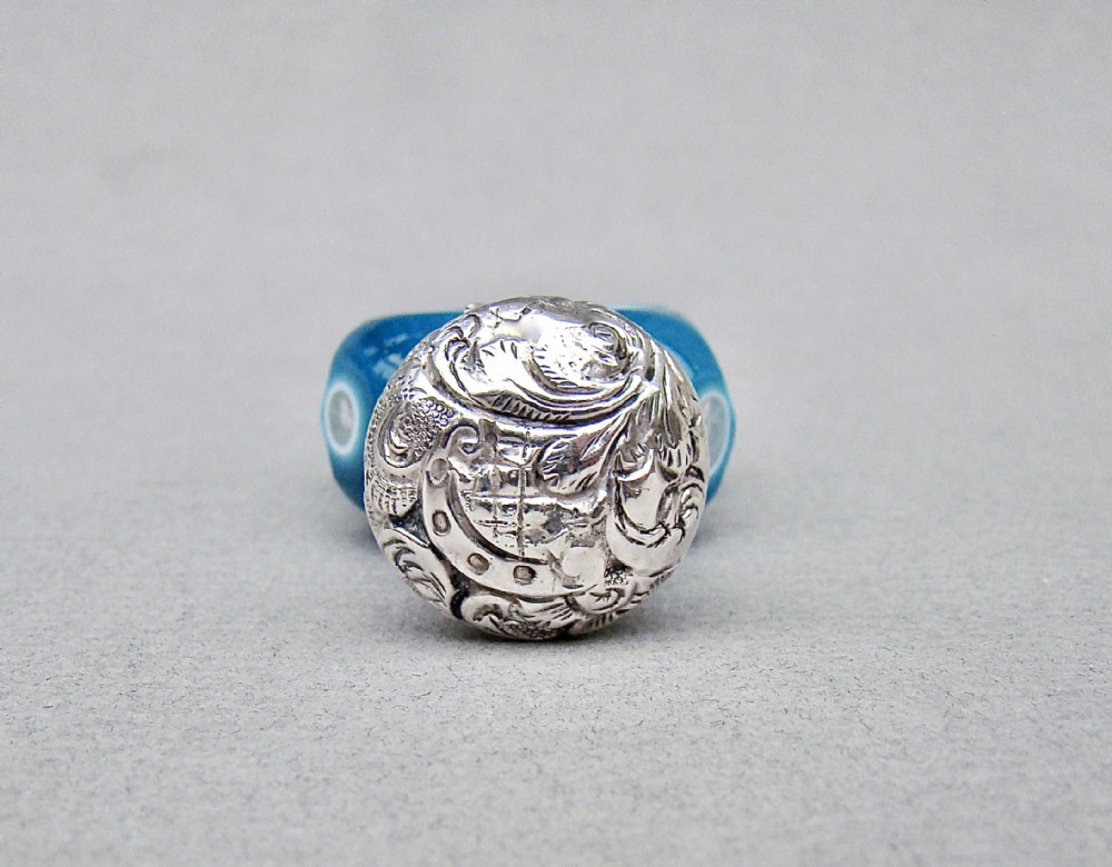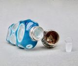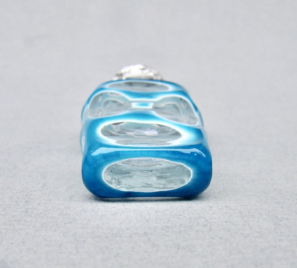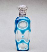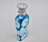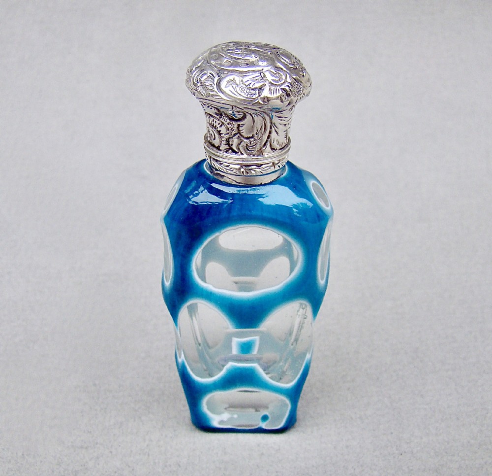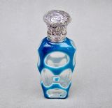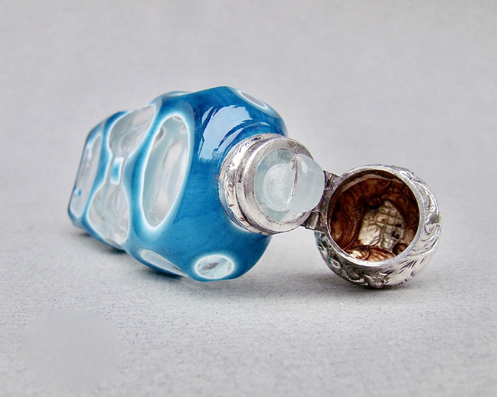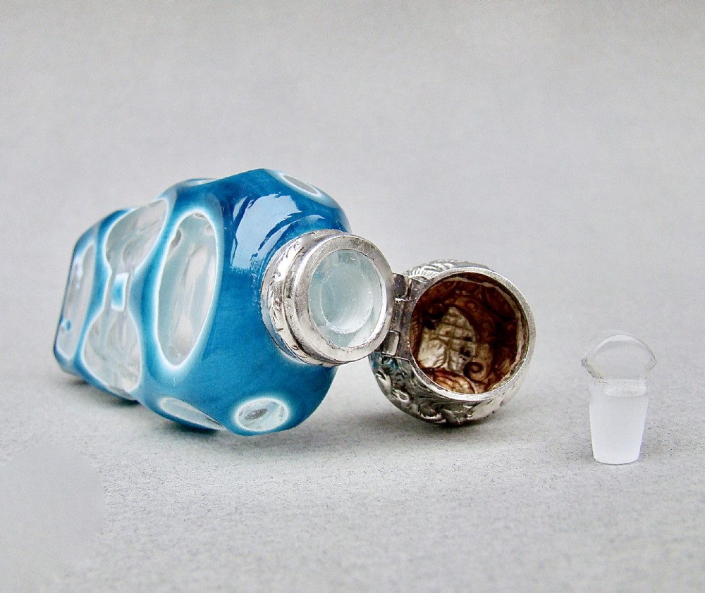 This fabulous overlay opaline glass silver mounted scent bottle dates circa 1890. The cut glass slender body a very rarely seen vivid turquoise colour cut to white opaline glass and then to clear glass with geometric patterns. The neck mounted with a beautiful embossed hinged silver lid and fitted with a clear glass stopper. Hallmarks: Unmarked, which was often the case with silver scent bottle lids but tested as silver. Dimensions: Height: 9cm - 3.6 inches. Maximum width: 3cm / 1.2 inches. Depth: 1.5 cm / 0.4 inches. Condition: Exvellent. Glass in very good condition. Inside of neck in excellent condition. No cracks. Silver lid in very good condition. Delivery: PLEASE DO NOT FORGET TO ADD POSTAGE AT CHECKOUT. Postage UK: £10.00 Royal Mail Special Delivery. Postage overseas: £25 International Signed For. PLEASE DO NOT FORGET TO ADD POSTAGE AT CHECKOUT. Postage UK: £10.00 Royal Mail Special Delivery. Postage overseas: £25 International Signed For. Postage USA (including US import duties): £45.00 You can pay by PayPal, bank transfer, cheque, debit or credit card. To pay by PAYPAL please add P&P and click on button below. To pay by credit or debit card over the phone or by cheque, please contact me on 01449 760 585. Internal Ref: MAR81