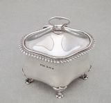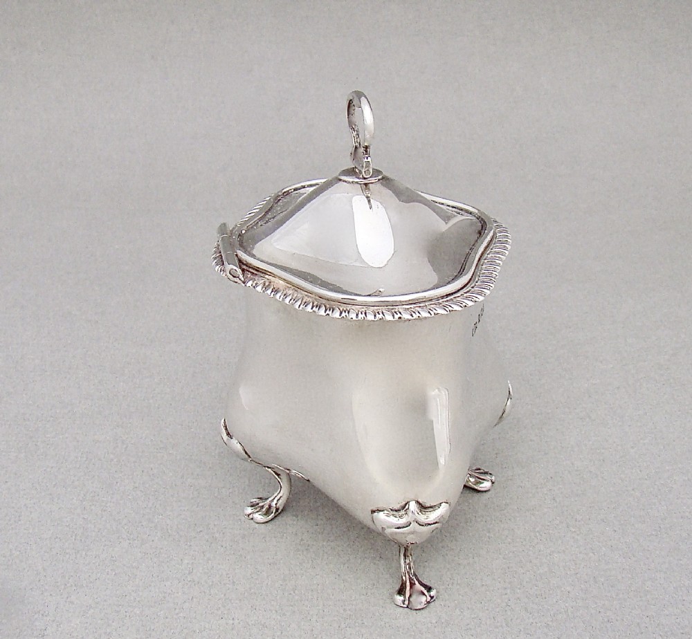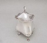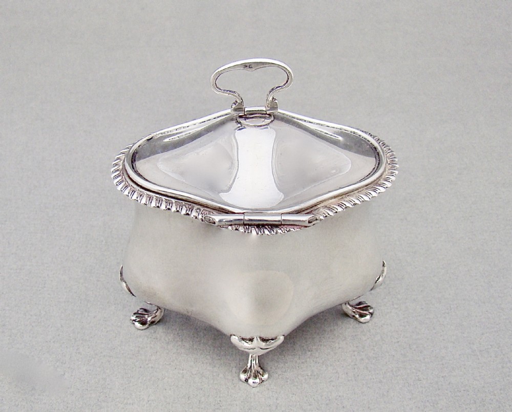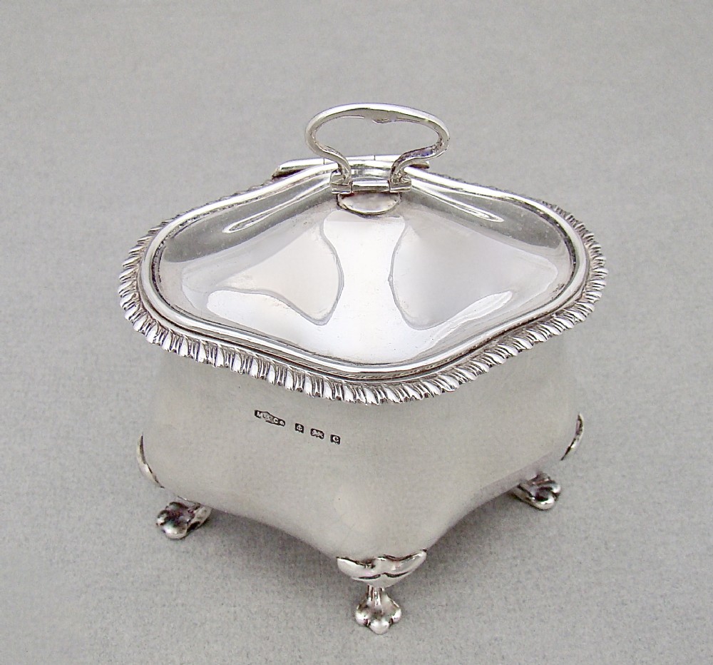 This charming and unusual Edwardian silver tea caddy is dated Birmingham 1902 and bears the marks of Marples and Co. It is a very tactile piece with its organic oblong shape and slightly domed hinged cover. The cover with an elgant gadroon border and drop-ring handle, the base raised o four scroll-capped trefoil feet. The interior with original pale gilt wash. A gorgeous and unusual tea caddy. Hallmarks: M&Co for Marples & Co. Lion Passant. Birmingham Assay Mark. Date letter "c" for 1902. Dimensions and Weight: Height up to finial:11cm / 4.4 inches Width: 10cm / 3.6 inches. Depth: 7cm / 3 inches. Weight: 161g / 5.7oz. Condition Very good. No dings. No dents. No repairs. PLEASE DO NOT FORGET TO ADD POSTAGE AT CHECKOUT. Postage UK: £5 Royal Mail Tracked 24. Postage overseas: £20 International Signed For. Postage USA (including US import duties): £45.00 You can pay by PayPal, bank transfer, cheque, debit or credit card. To pay by PAYPAL please add P&P and click on button below. To pay by credit or debit card over the phone or by cheque, please contact me on 01449 760 585. Internal Ref: AVR99