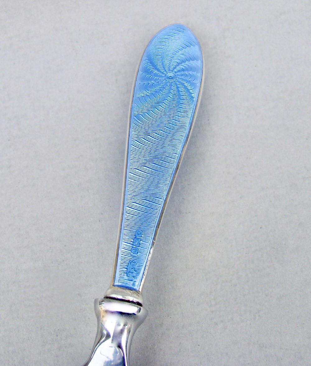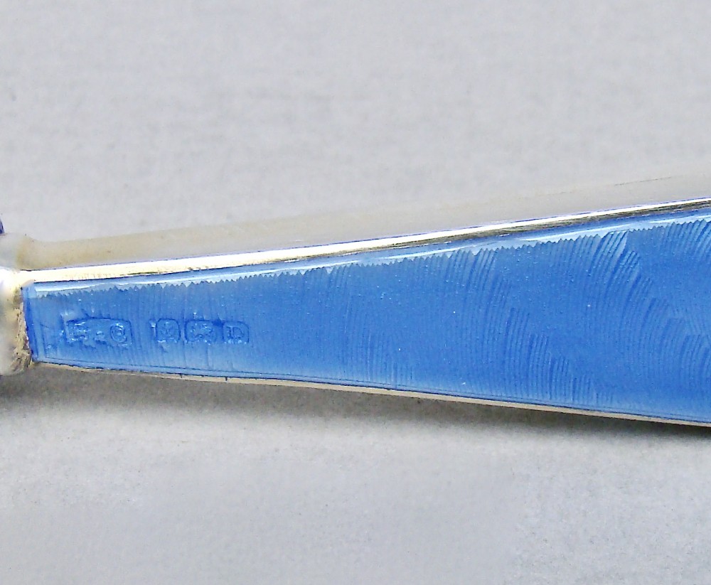 This elegant Art Deco silver and guilloche enamel handled letter opener was made by the prolific W I Broadway & Co and is dated Birmingham 1929. The stainless steel blade mounted with a silver handle. Both front and back of the handle inset with a beautiful sunburst sky blue guilloche enamel. A very elegant and timeless piece. Hallmarks: B&Co for W I Broadway & Co. Birmigham Assay mark. Lion Passant. Date letters "D" for 1929. Condition: Very good. Dimensions: Length: 20cm / 8 inches. Maximum width: 2 cm / 0.6 inches. Delivery: PLEASE DO NOT FORGET TO ADD POSTAGE AT CHECKOUT. Postage UK: £5 Royal Mail Tracked 24 Postage overseas: £15 International Signed For. You can pay by PayPal, bank transfer, cheque, debit or credit card. To pay by PAYPAL please add P&P and click on button below. To pay by credit or debit card over the phone or by cheque, please contact me on 01449 760 585. Internal Ref: AVR93