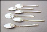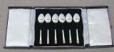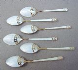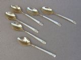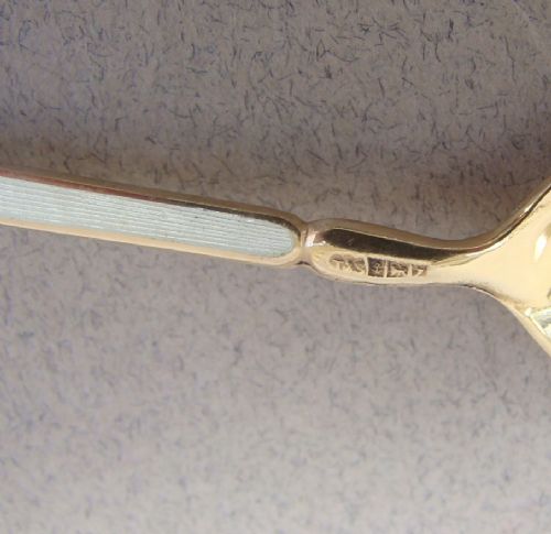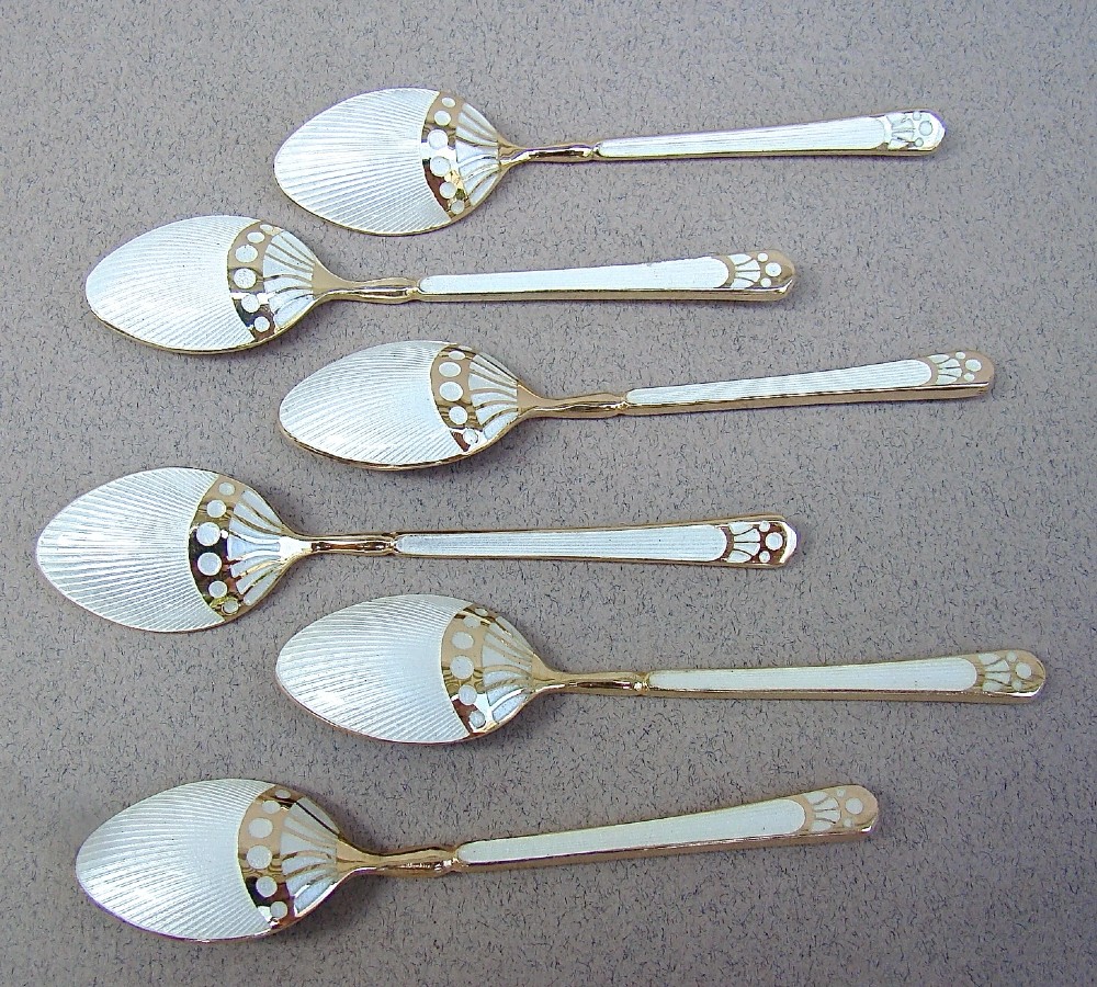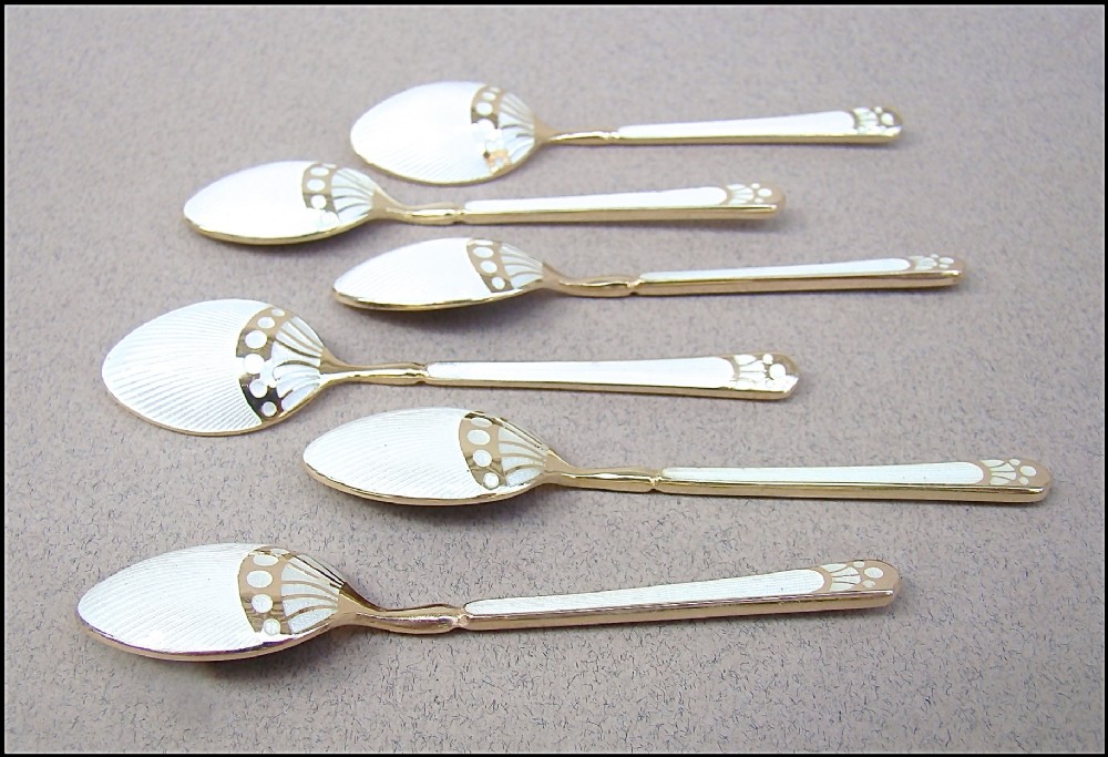 This exquisite cased set of six silver gilt & guilloche enamel demi-tasse coffee spoons is dated Birmingham 1924. Enamelled coffee spoons were very popular in the twenties and this is a lovely and rather unusual example. The back of the bowls decorated in a delicate oyster coloured guilloche enamel inlaid with silver gilt patterns.