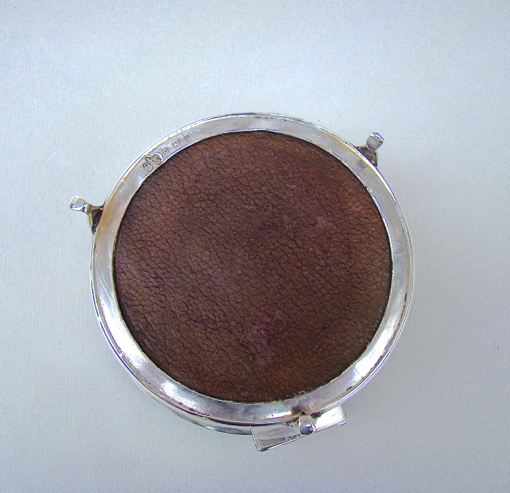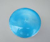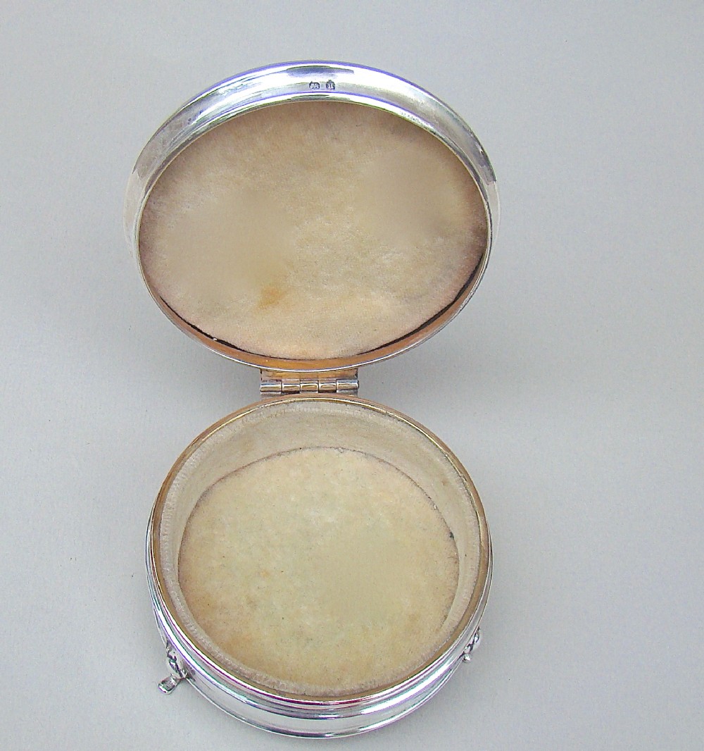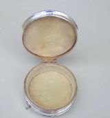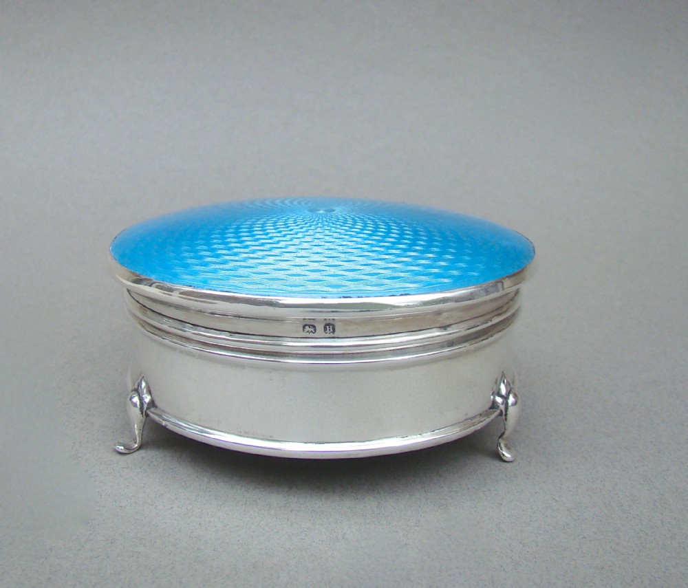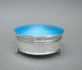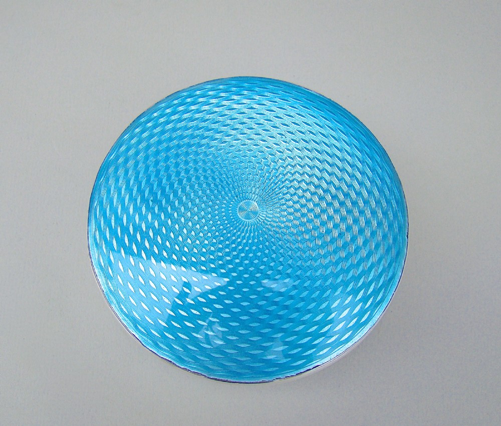 This is a superb large size silver mounted guilloche enamel circular jewellery box in a stunning sky blue colour. The hinged cover opening to reveal the original velvet interior.