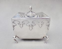 This is a very distinctive solid silver Art & Craft three piece tea service made by Charles Edward, renowned Arts & Craft silversmith. The teapot of squat circular form with a spot hammered finish and slightly domed hinged cover. The unusually elongated wood handle with exquisite sinuous silver leaf terminals . Raised on three bracket feet. Both spot-hammered cream jug and sugar bowl with bifurcated leaf-capped handles.