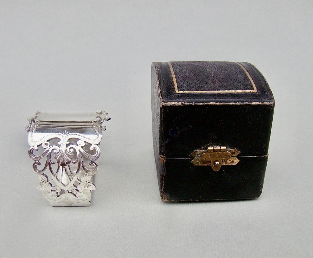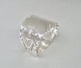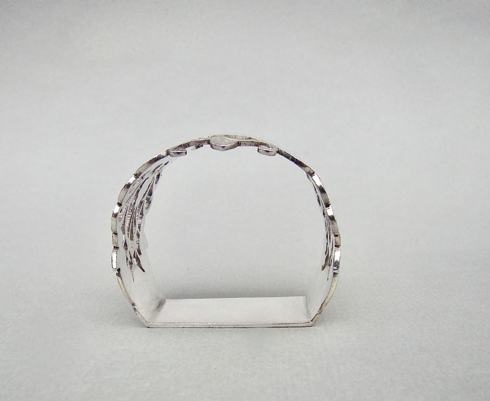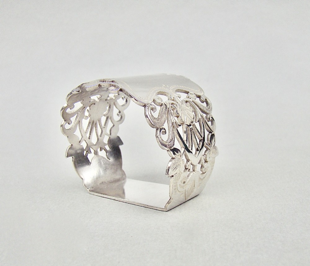 This superb quality Edwardian silver napkin ring bears the marks of the Levesley Brothers and is dated Shefffield 1905. Of unusual semi circular form, the pierced sides emanating from a flat rectangular base. The top with vacant reserve.