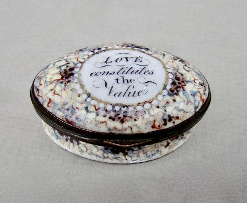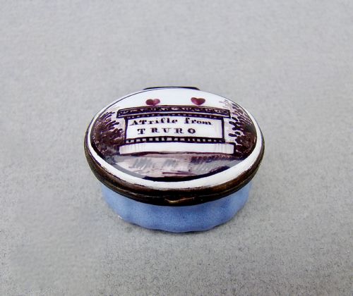 There were patch and snuff boxes, boxes for trinkets and jewellery, bonbonnieres. These boxes became, with the advent of transfer printing, little gift boxes given as token of love and friendship or souvenirs from various towns. This surviving example is transferred with the words "A Trifle from Norwich" .