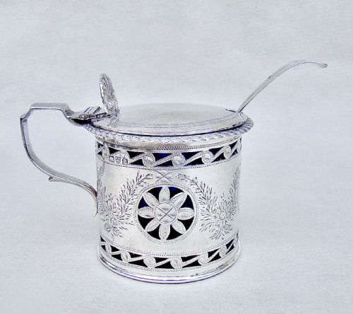 This very elegant sterling silver mustard pot is dated Birmingham 1910 and was made by the sought-after silversmith William Hutton. Of traditional oval form , the plain sides with a distinctive rope-twist border, giving it an Arts & Craft look. The domed cover with urn shaped finial. The back with elegant scroll handle. Fitted with the original blue glass liner and sold with a very well matched sterling silver mustard spoon by John Round, dated Sheffield 1909.