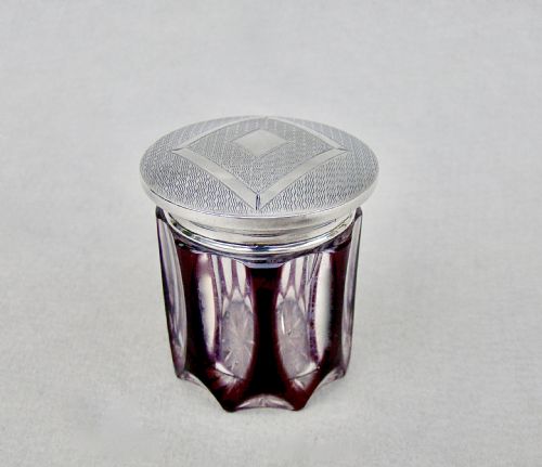 This stunning Art Deco silver and vivid yellow guilloche enamel jar is dated Birmingham 1934. It bears the retailers marks of J.C. Vickery, of 145 Regent Street in London and was made by William Neale & Son Ltd. The exquisite sunburst patterned guilloche enamel lid with solid silver stepped finial, very much in the Art Deco manner.