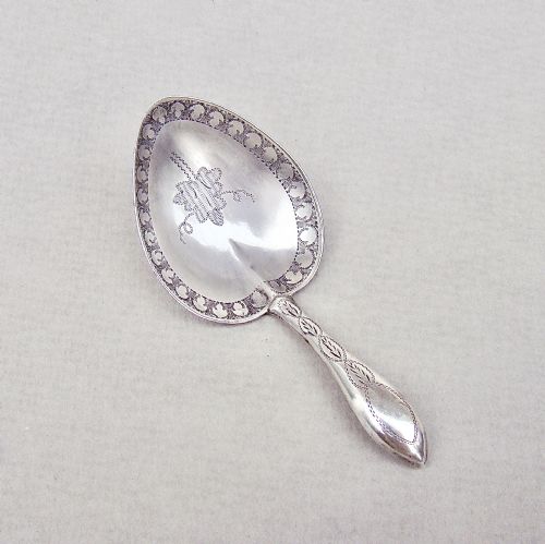 This exquisite George III silver jockey cap caddy spoon was made by the very collectable Birmingham silversmith and toy maker* Samuel Pemberton and dates circa 1795. The plain oval bowl with a central reserve stuck with maker's marks only. The inner bowl with bright-cut engraving . Jockey cap caddy spoons are very collectable and this is a lovely example by a renowned silversmith.